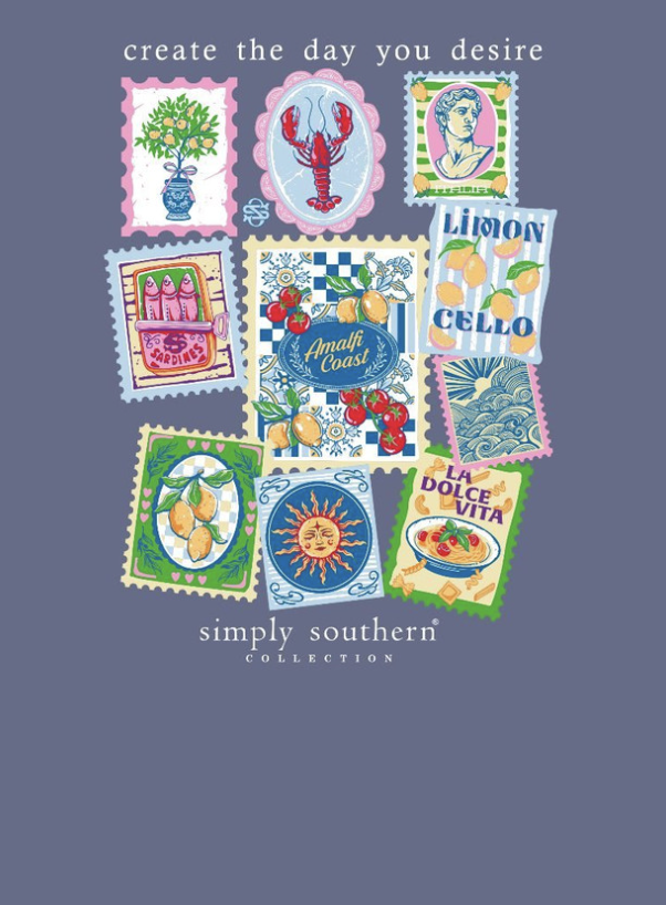 Made from 100% soft, breathable cotton, this short sleeve basic tee delivers all-day comfort in a clean, classic cut. This denim blue tee features a cheerful collage of colorful postage stamps with a Mediterranean theme and the phrase 'Create the day you desire'.