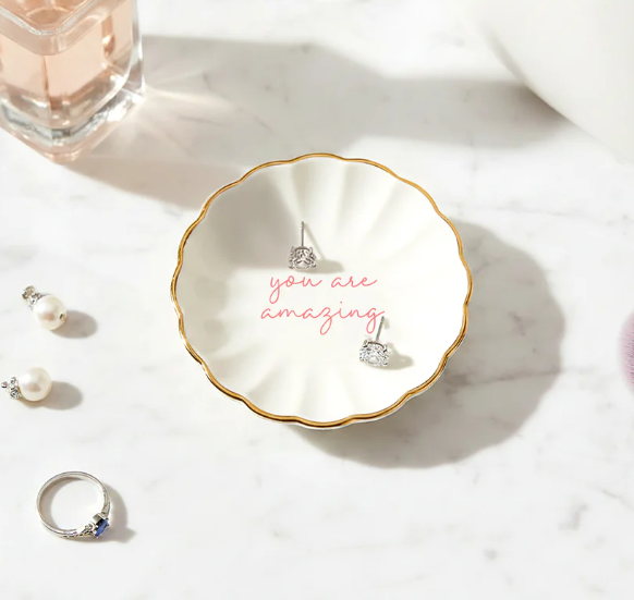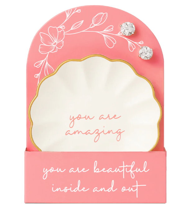 IN-HOUSE DESIGN: The dish features the bold, uplifting sentiment “you are amazing” in coral red, with a coordinating deep pink backer card that reads “You are beautiful inside and out.”