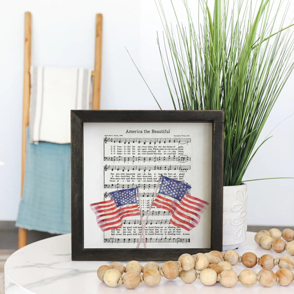 This striking rustic frame celebrates American pride with a bold, patriotic design that captures the spirit of the nation. The artwork features rich, earthy tones and classic typography that evokes timeless Americana, creating a warm, nostalgic atmosphere perfect for any room seeking authentic character. The composition balances simplicity with impact, drawing the eye to its meaningful message while the natural wood frame grounds the piece in rustic elegance. A heartfelt reminder that shares "America The Beautiful".