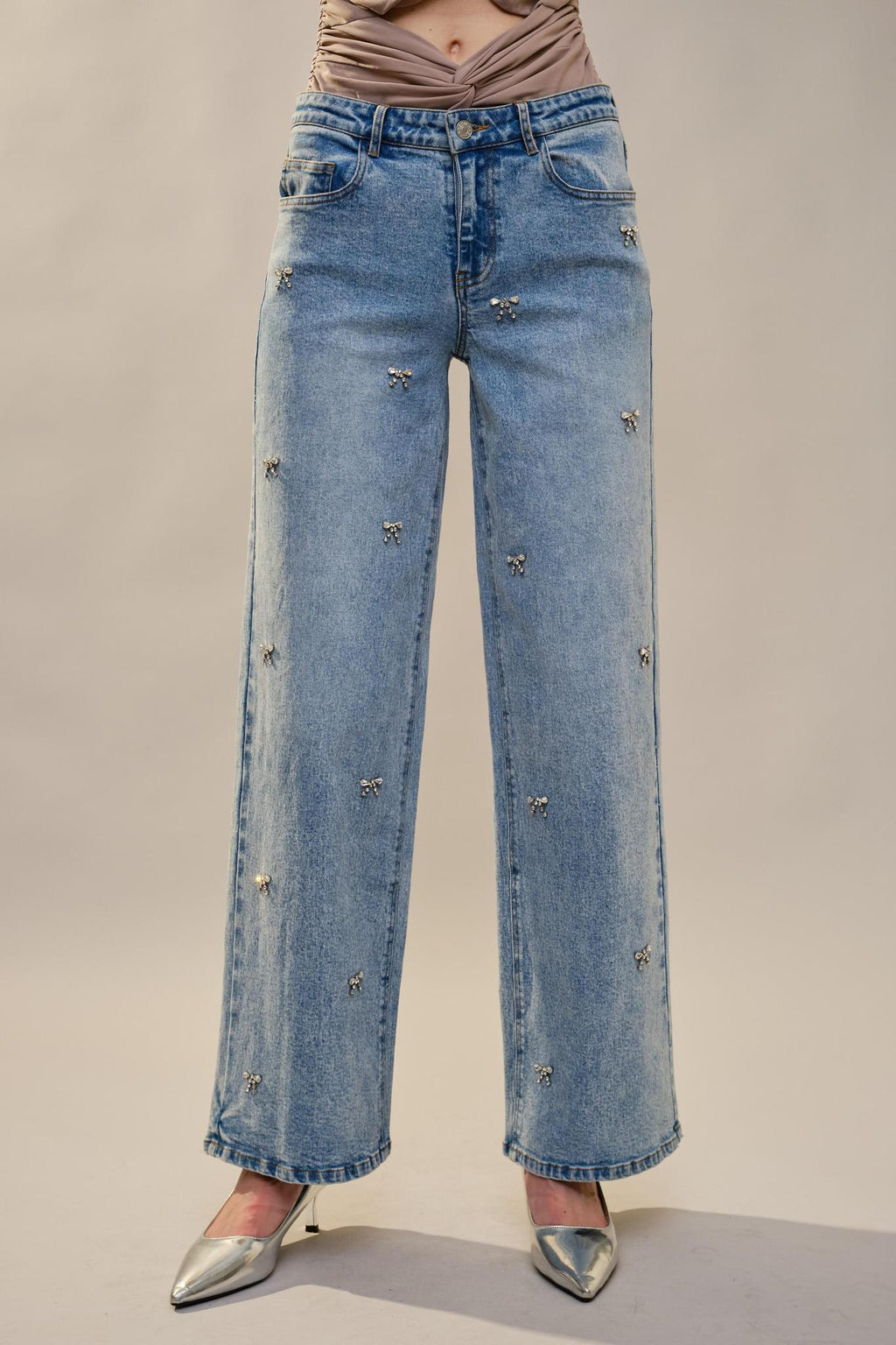 High rise straight leg jeans in a light wash, detailed with scattered crystal bow embellishments for a playful yet refined accent. Classic five-pocket design with zip fly and button closure. 98% Cotton, 2% Spandex Model is 5'8" tall and wearing size Small