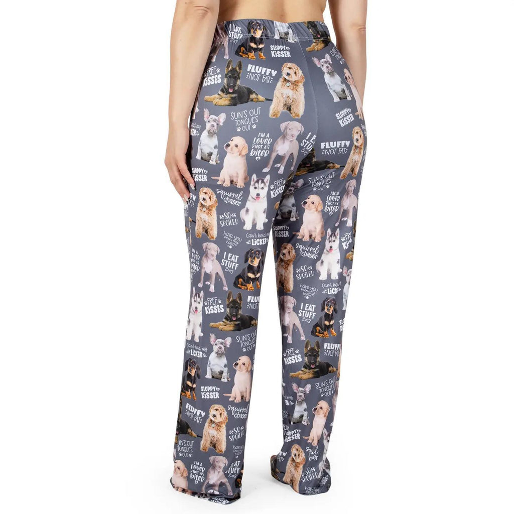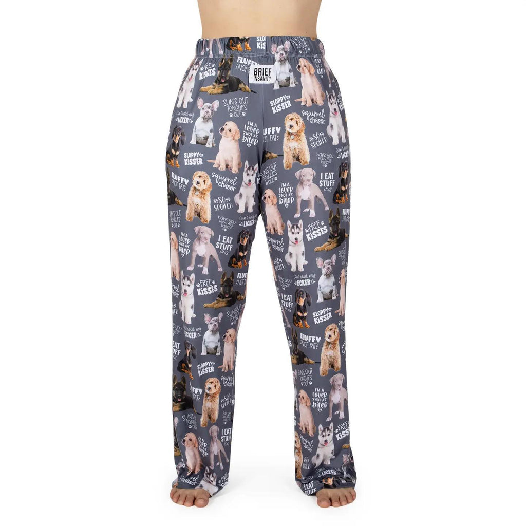 BRIEF INSANITY's newest Chalkboard Dog pajama lounge pants for 2024. Slide into ultimate doggy delight with these lounge pants that are the epitome of canine cool! Set against a gray chalkboard-style backdrop, a whimsical array of adorable puppy graphics steals the show. From the goofball who proudly proclaims "I Eat Stuff" to the cuddle enthusiast offering "Free Kisses," and the perpetual adventurer on a mission as a "squirrel chaser," each pup adds its own touch of charm. It's like wearing a playful pup personality parade.