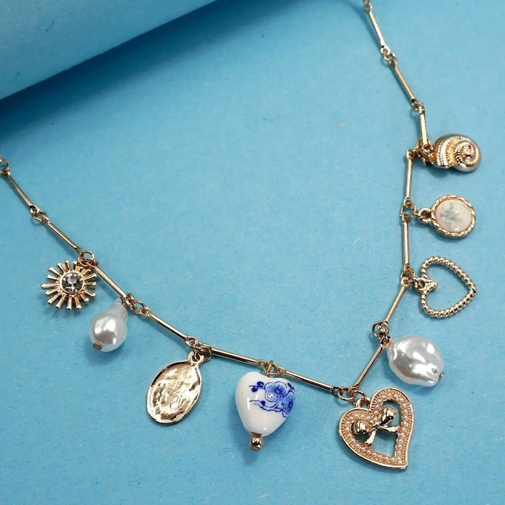 Charm Necklace, featuring Ceramic Porcelain Heart, lustrous Pearl, a blend of vintage charm with timeless designs. This unique piece adds a touch of romance and sophistication, making it for a balanced and graceful look.