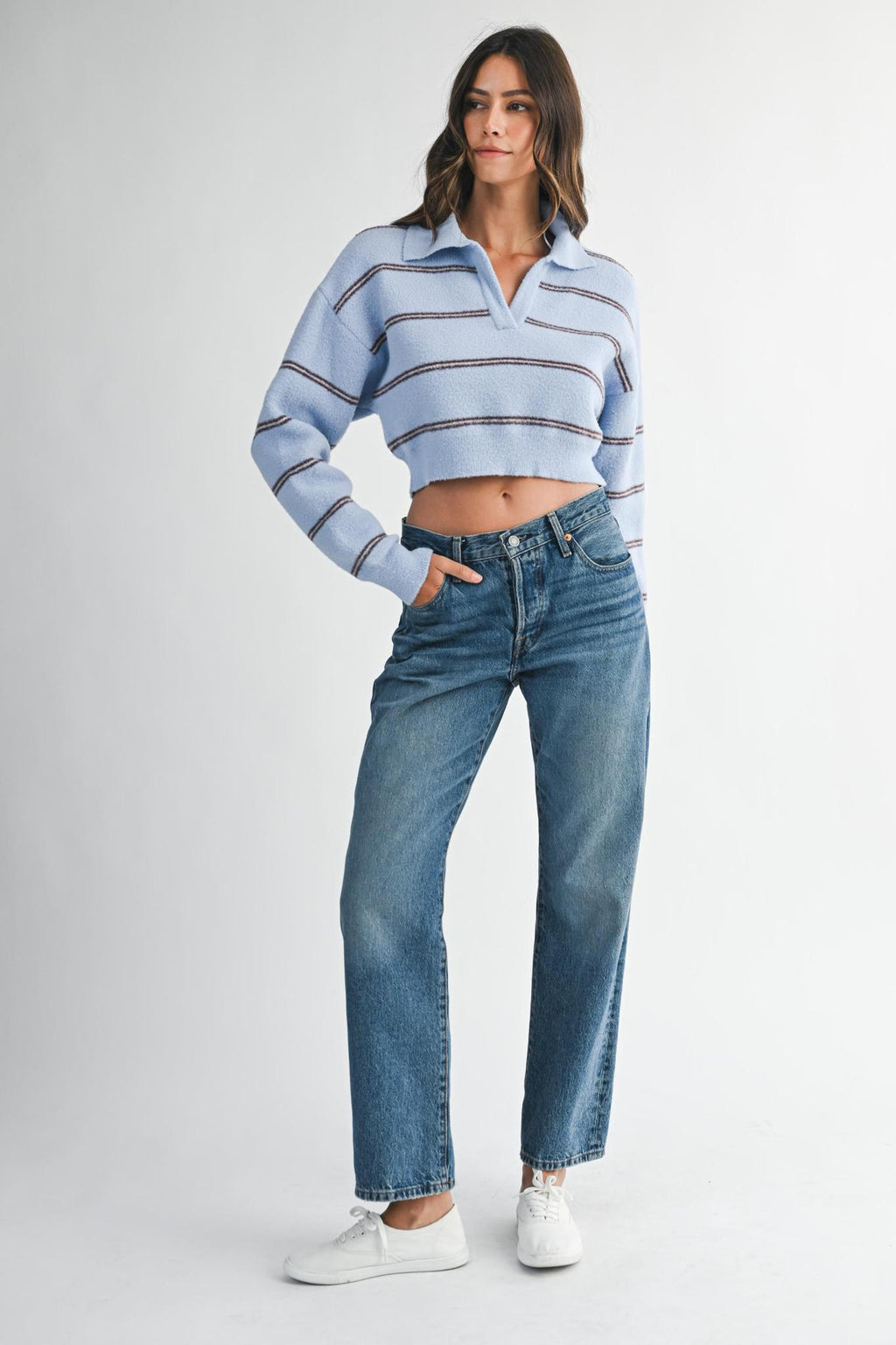 Multi color stripe knit collar v neckline polo long sleeve pullover crop sweater top.