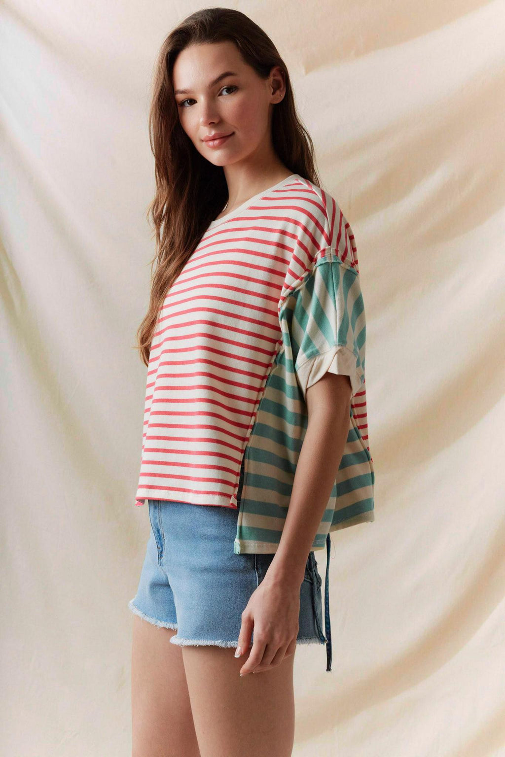 Product Name: Stripe Color Block Tee Product Category: Tops, T-shirts Collection: SPRING/SUMMER 2025 Size: The Model is Wearing a Size Small. (HEIGHT 5'9" / BUST: 30.5" / WAIST: 24" / HIPS: 34.5") Material: 100% Cotton Neckline: Round Neck Tags: Short sleeves