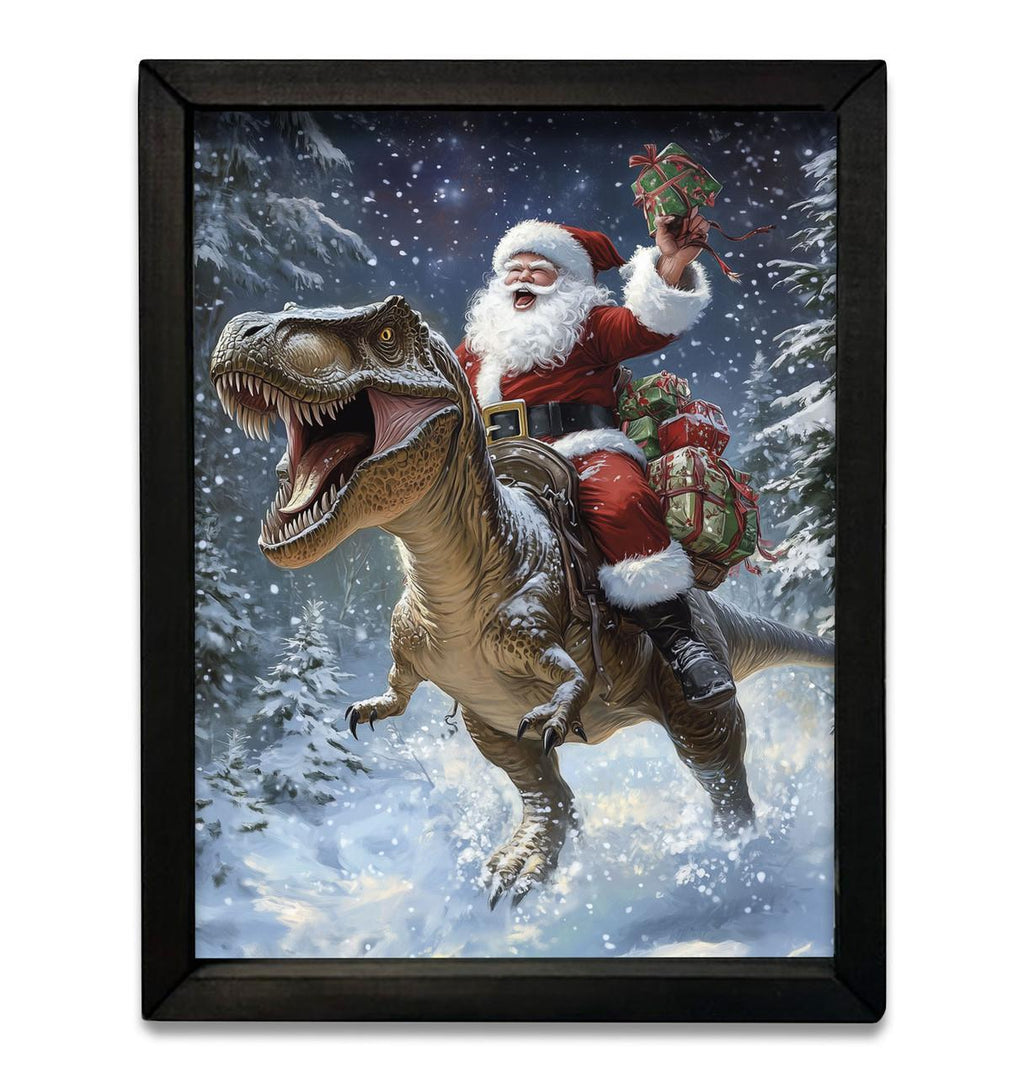 This box frame, titled "Dino Santa" is available in a variety of sizes. The picture is a whimsical, fun-filled scene perfect for someone who loves dinosaurs and Santa. Santa Claus is riding triumphantly on the back of a mighty T. rex, both charging through a snowy landscape in the midst of a snowstorm. Santa, in his traditional red suit, has a big grin on his face as he holds a gift high above his head, ready to deliver it. Around them, snowflakes swirl in the storm, creating an adventurous and festive mood as Santa and his dino companion race through the snowy wilderness on their holiday mission. It is UV protected so you will never have to worry about fading! The Poplar wood frame is espresso stain and will add about one inch per side with an amazing 1.5 inch thickness. The Box Frame also gives you options, you can hang it from the wire hanger that is attached to the back, or you can sit it on a flat surface!