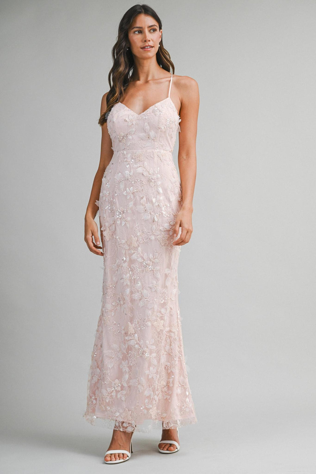 Embellished lace maxi dress featuring 3D floral appliqué with sequin and bead detailing throughout. Designed with a V-neckline,