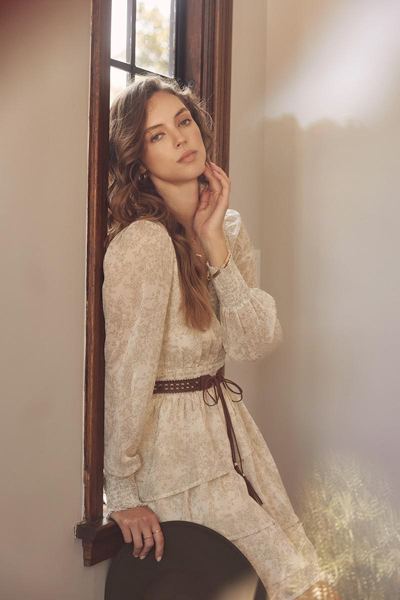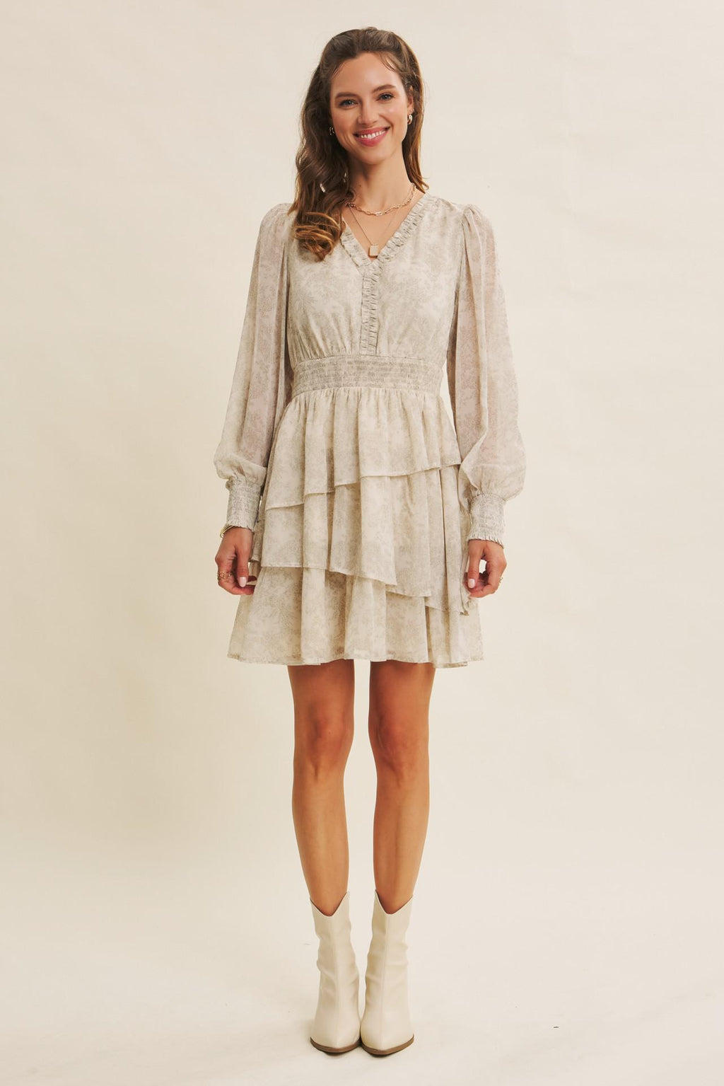 Floral mini dress with ruffled v-neckline, smocked waist and cuffs, and tiered asymmetrical skirt. Long balloon sleeves, lined. Easy to wear for weddings or everyday. Features - Ruffled v-neckline - Smocked waist and cuffs - Asymmetrical tiered ruffle skirt - Mini dress - Long balloon sleeves - Lined - Floral print Size + Fit Model is 5'9.5" and wearing a size Small Please refer to our size chart.