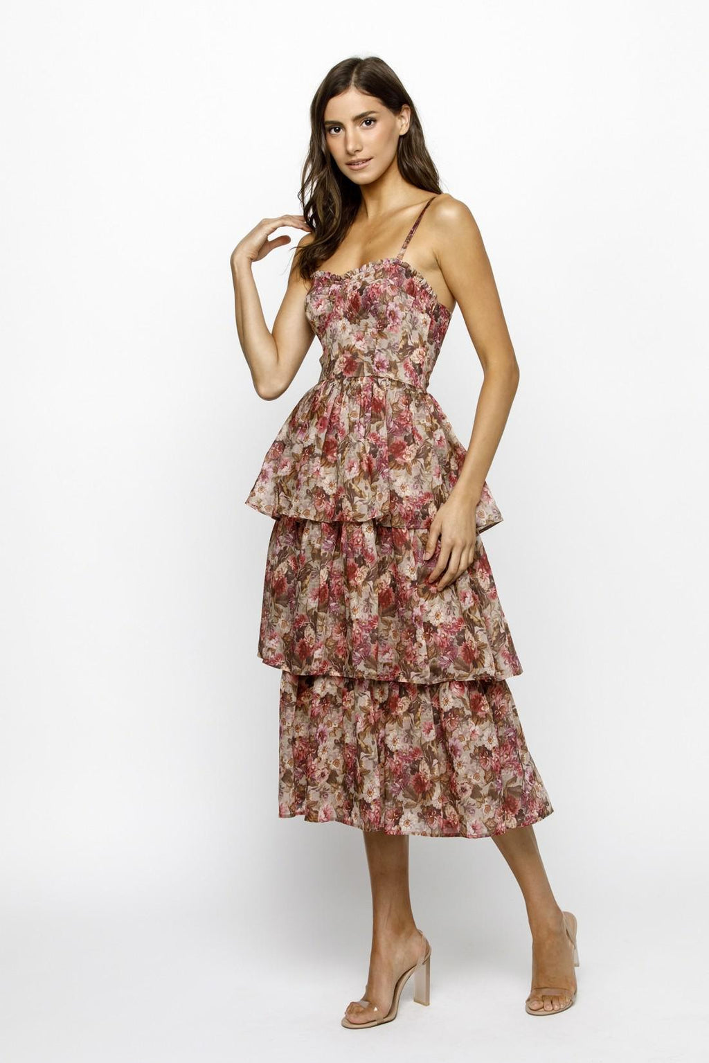The realistic bustier-tiered layered organza midi dress features a sweetheart neckline, adjustable spaghetti straps, and ruffled trim along the neckline.
