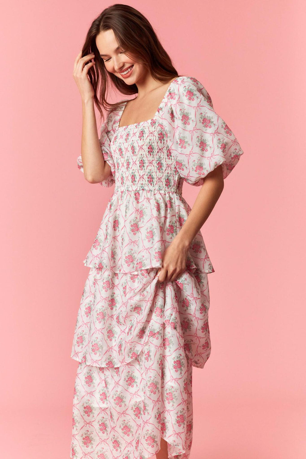 Product Name: Floral Printed Bubble Short Sleeve Tiered Midi Dress Product Category: Dress Collection: Spring/Summer 2026 Size: The Model is Wearing a Size Small. (HEIGHT 5'9" / BUST: 30.5" / WAIST: 24" / HIPS: 34.5") Material: 100% Polyester Neckline: Square Neck Tags: Mid Length