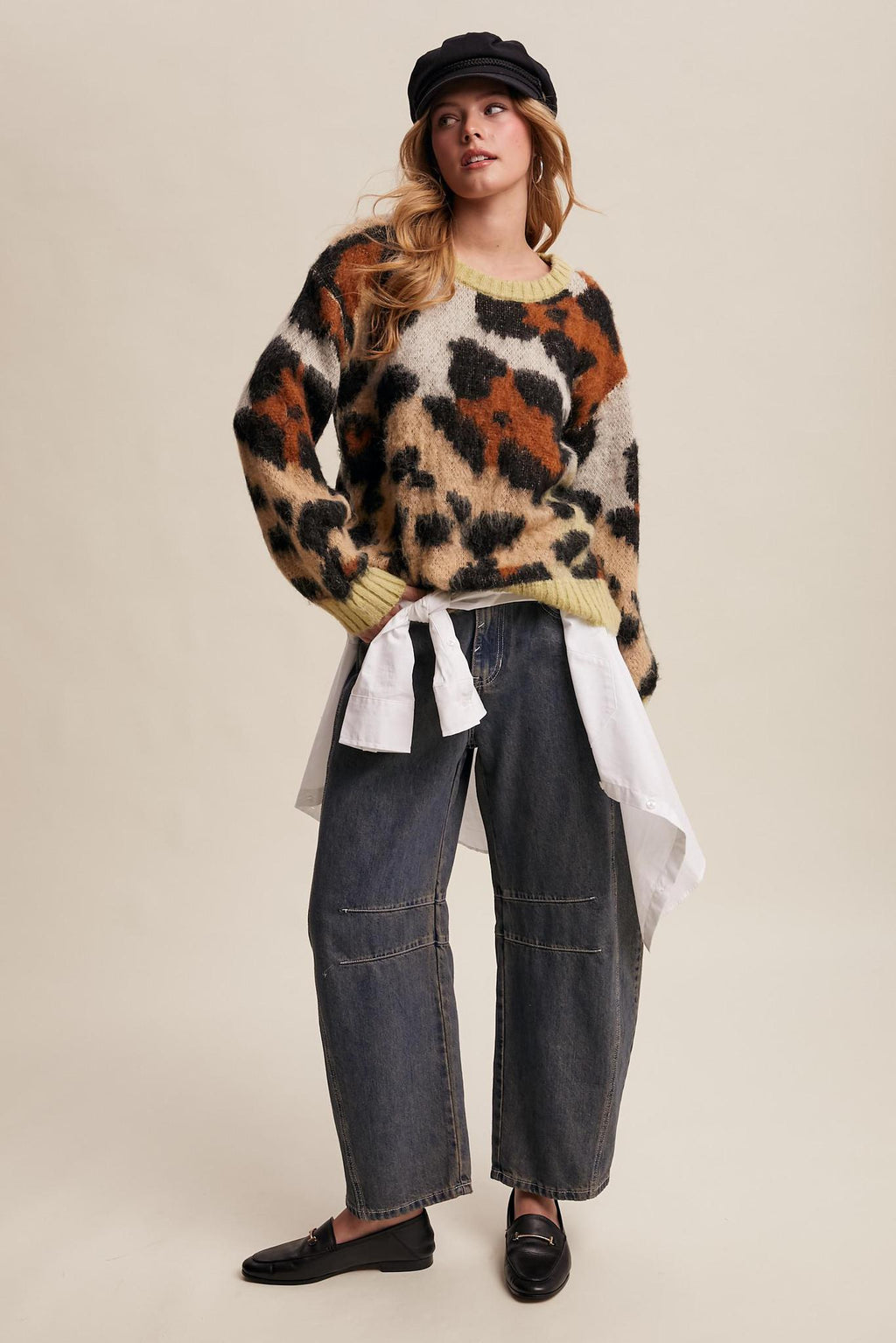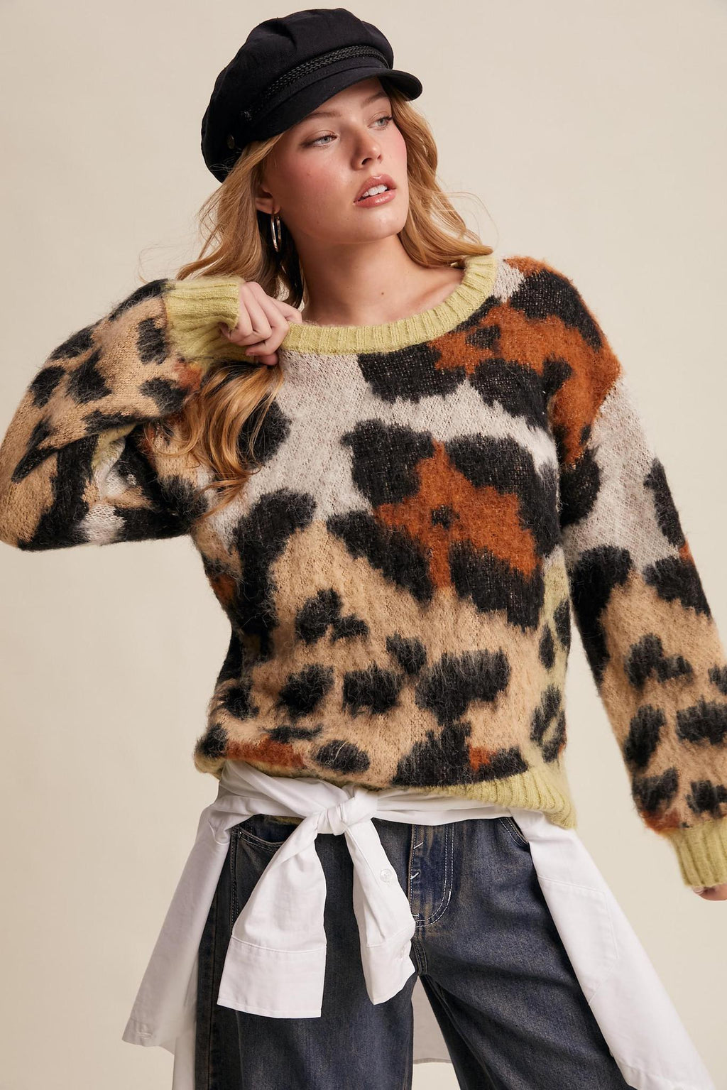 A dreamy blend of abstract art and wild animal print, this sweater brings playful edge and cozy comfort to your winter wardrobe.