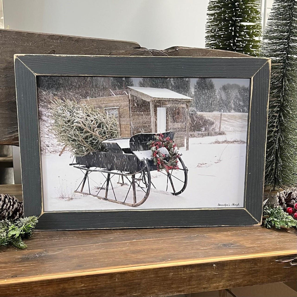 This charming Grandpas Sleigh 18x24 print captures the essence of winter with its nostalgic scene of an old sleigh carrying a Christmas tree. A perfect addition to your holiday decor!