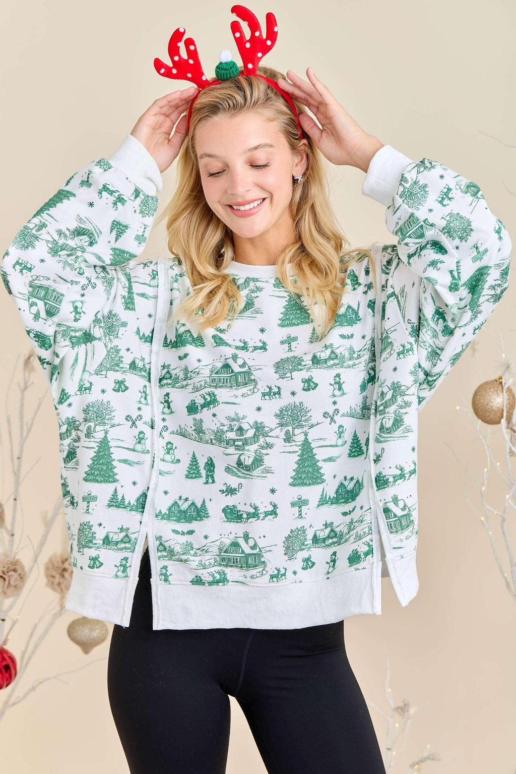 Christmas village sweatshirt, holiday print sweater, winter scene pullover, festive cabin sweatshirt, holiday jumper, green Christmas sweatshirt, cozy holiday sweater, scenic print pullover, winter wonderland top, Christmas outfit women, holiday party sweater, seasonal gift clothing, festive print sweatshirt, casual Christmas pullover