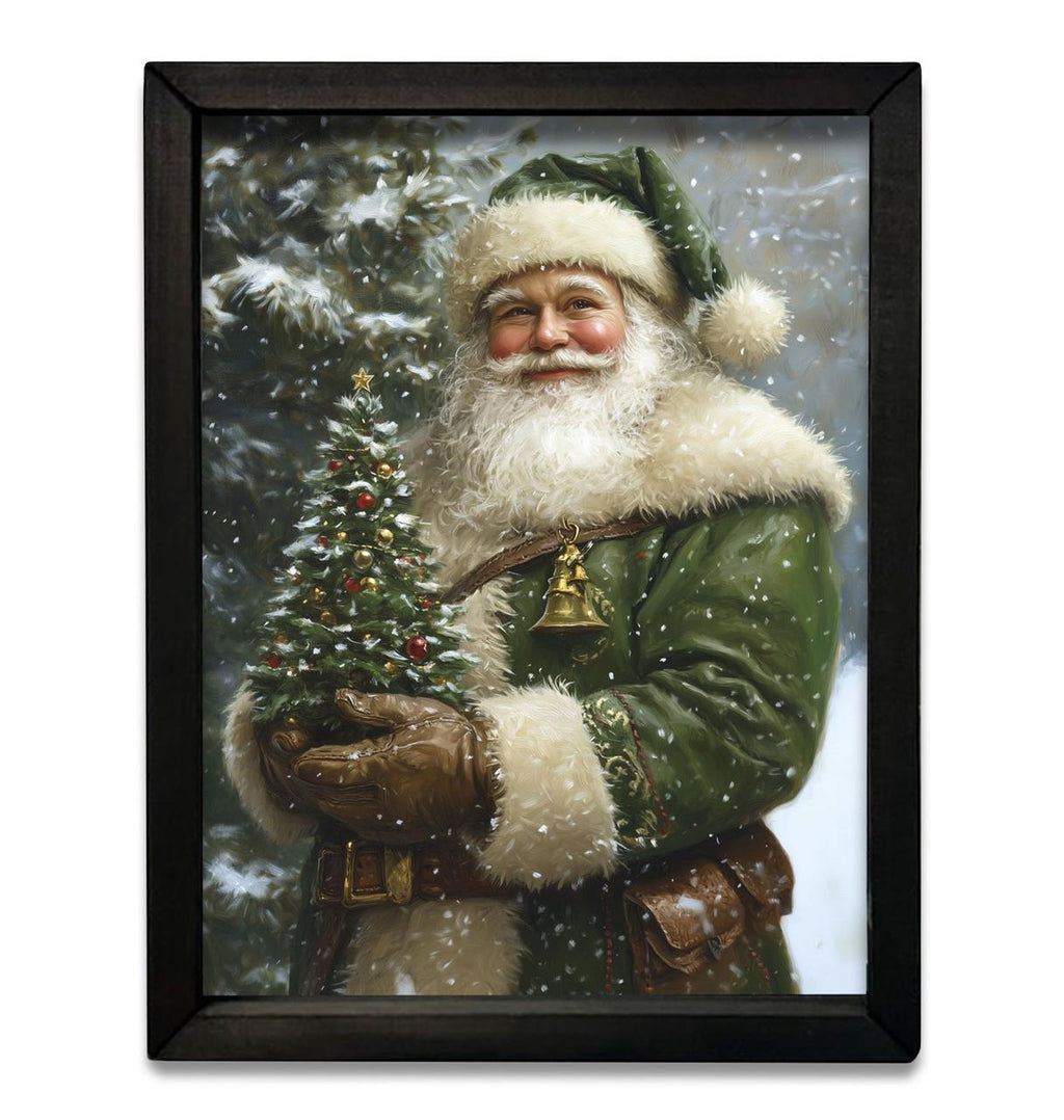 This box frame, titled "Green Santa" is available in a variety of sizes. The picture features Santa, but this time he’s dressed in a unique green suit with white fur trim, giving him a fresh and festive look. He stands outside in a snowy landscape, with snowflakes gently falling around him. In his hands, he holds a tiny Christmas tree, its branches adorned with red and gold ornaments and topped with a shining star. Santa’s brown leather gloves add a touch of warmth and rustic charm to his outfit. The serene winter setting, along with the glowing tree and Santa’s joyful expression, creates a magical and heartwarming holiday scene. It is UV protected so you will never have to worry about fading! The Poplar wood frame is espresso stain and will add about one inch per side with an amazing 1.5 inch thickness. The Box Frame also gives you options, you can hang it from the wire hanger that is attached to the back, or you can sit it on a flat surface!