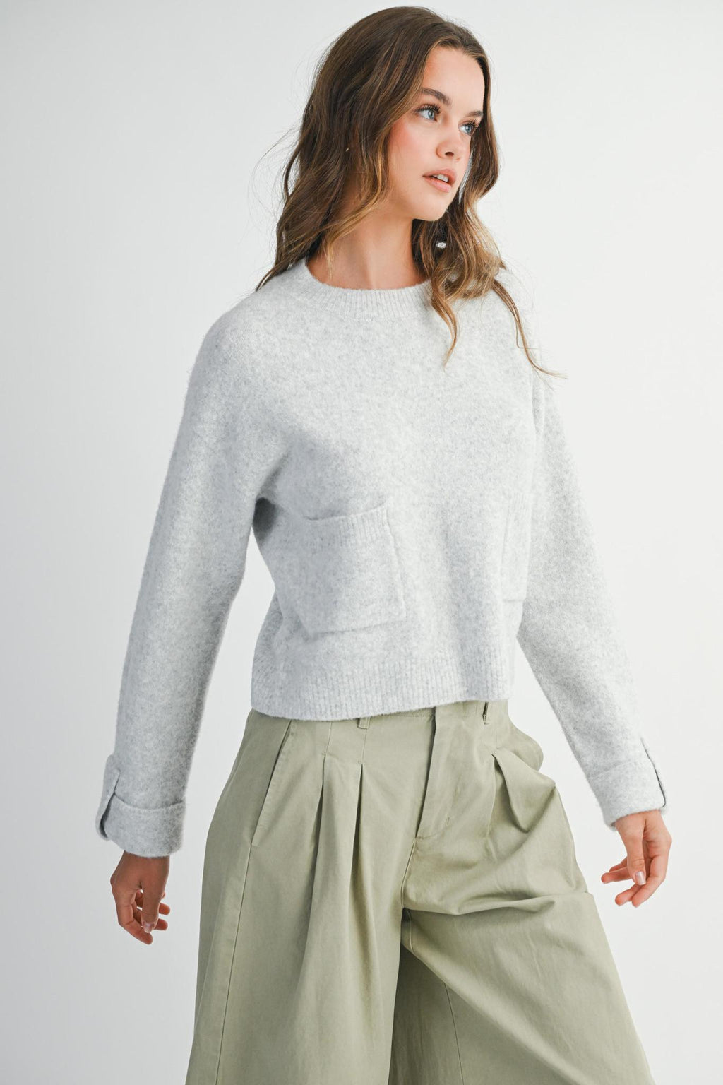 Solid crew neckline long sleeve with fold cuff detail knit pullover sweater top. Double front pocket detail.