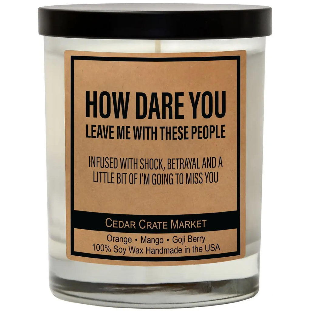 How Dare You Leave Me With These People Infused With Shock, Betrayal And A Little Bit Of I'm Going To Miss You SCENT: #4 Patchouli Orange. The aromatic scent of ripe oranges and patchouli will fill your home with notes of Goji Berry and ripe mango. NOTES: Top: Goji Berry, Middle: Ripe Mango, Bottom: Tarocco Orange