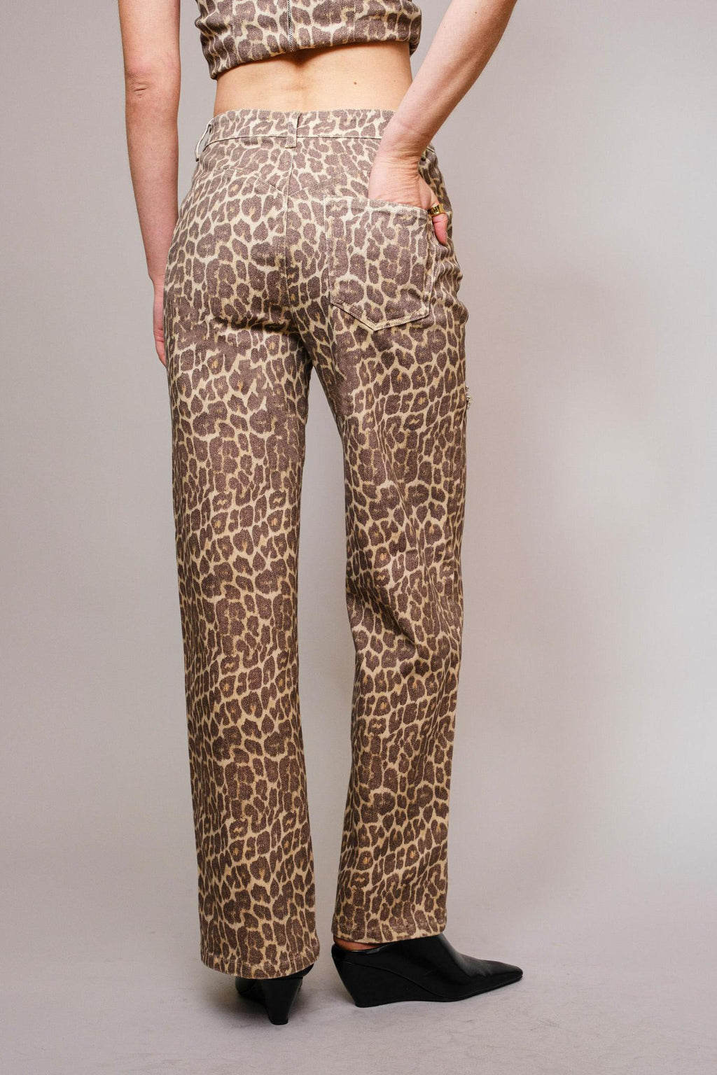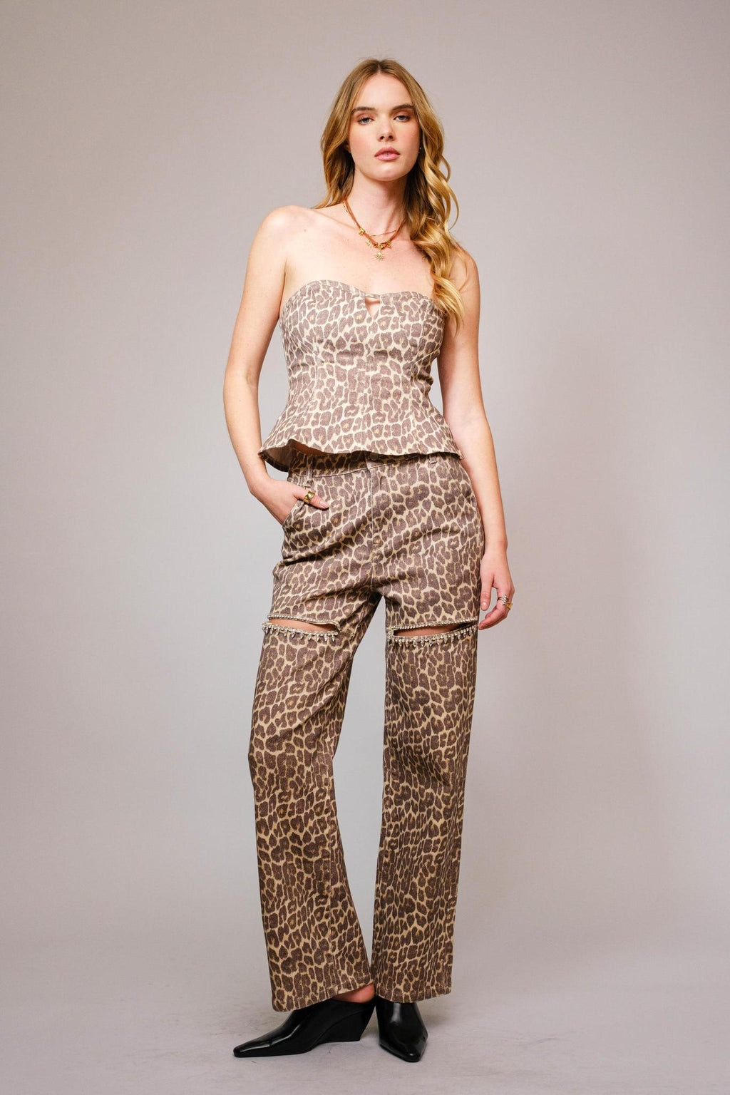 Mid-rise denim jeans featuring a bold leopard print, knee cutout details, and rhinestone embellishments. Crafted from twill fabric with a slight stretch for a structured yet comfortable fit. 95% Cotton 5% Spandex Model is 5'10" and wears a size Small