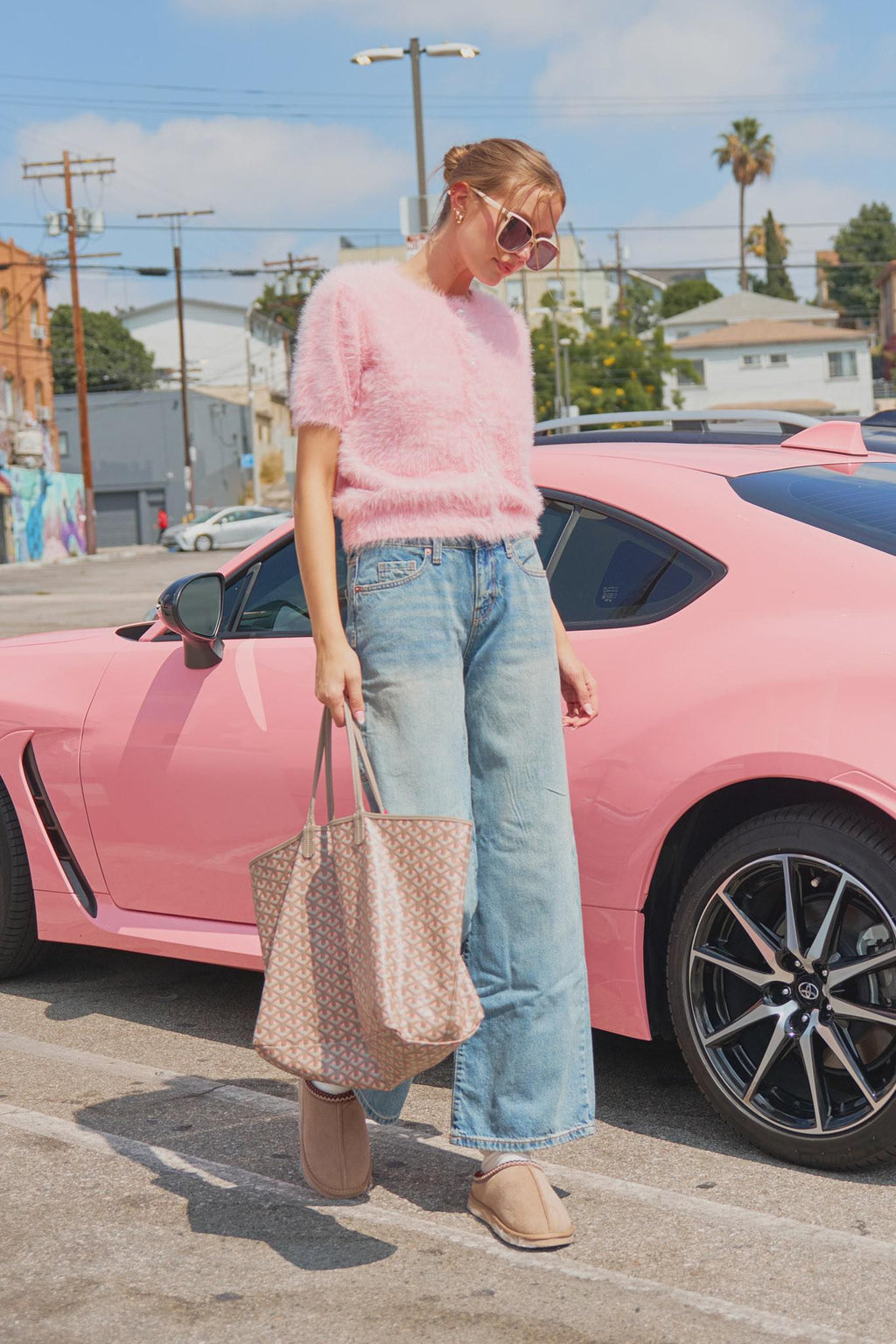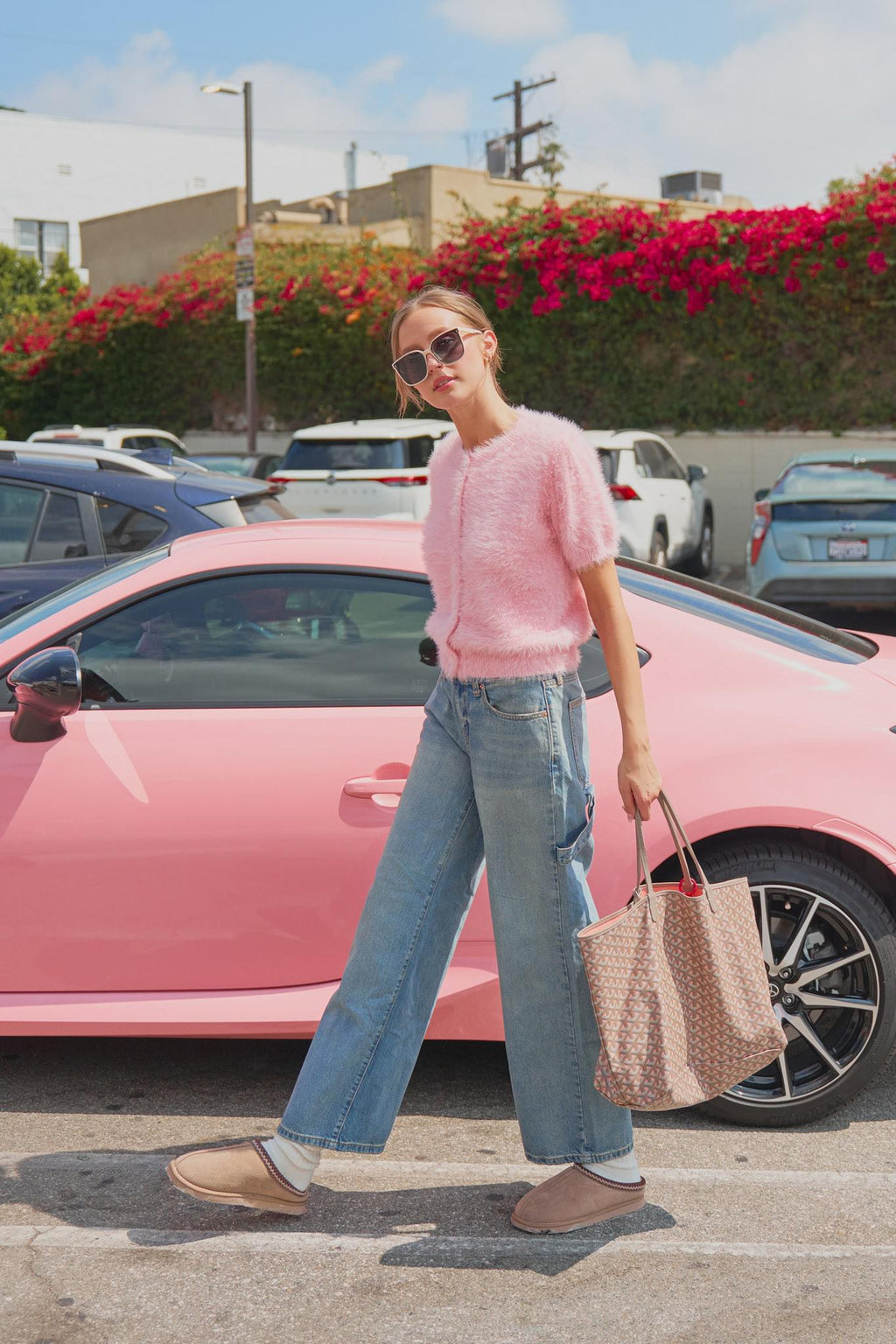 + Fuzzy mohair knit short sleeve sweater cardigan + Round neckline + Button down placket + Pearl buttons + Short puff sleeves + Relaxed, waist length fit + Model is 5' 10.5" 32-24-36 and wears a S