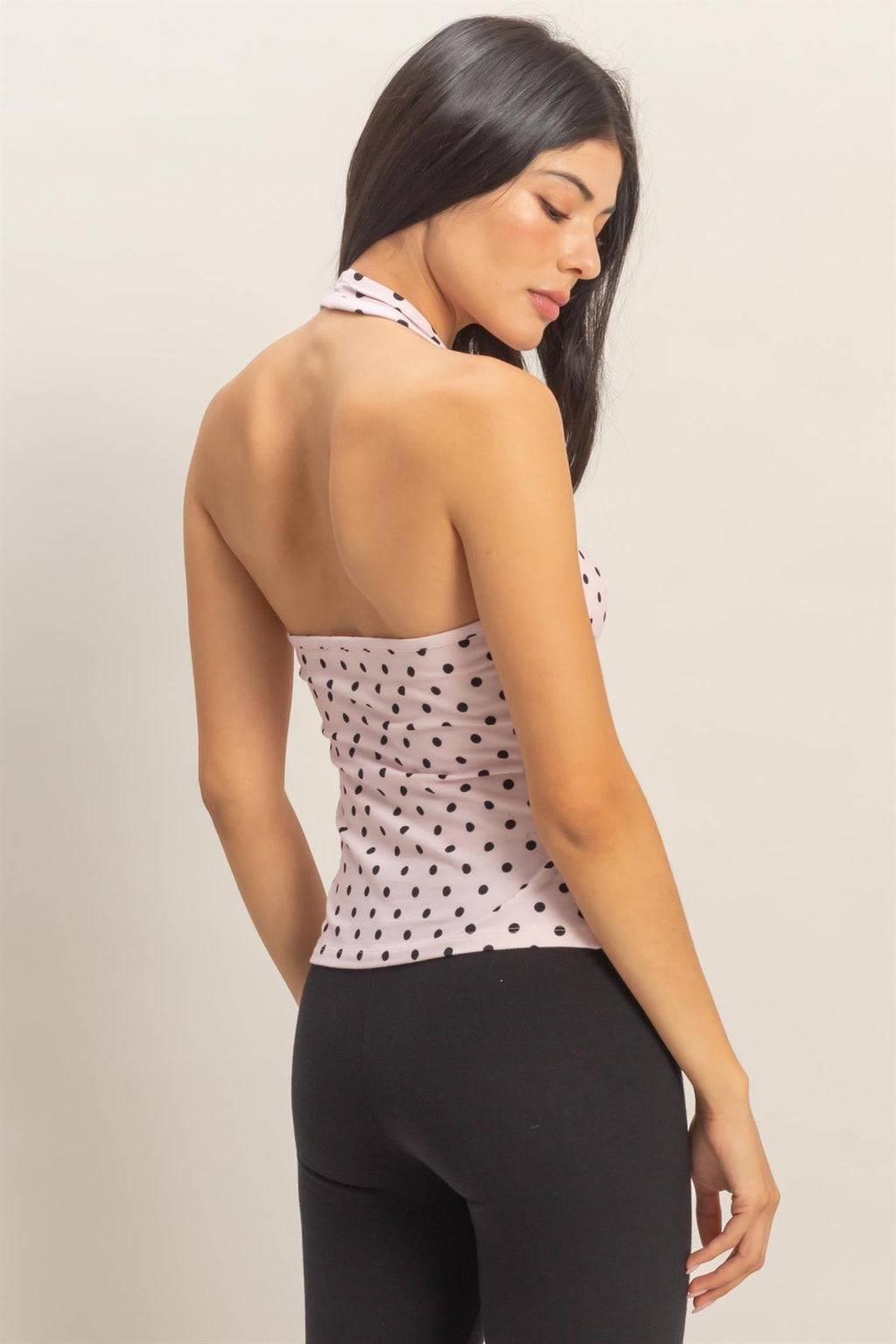 Exude vintage charm in this polka dot halter top, crafted from a soft cotton-spandex blend. It highlights a classic halter