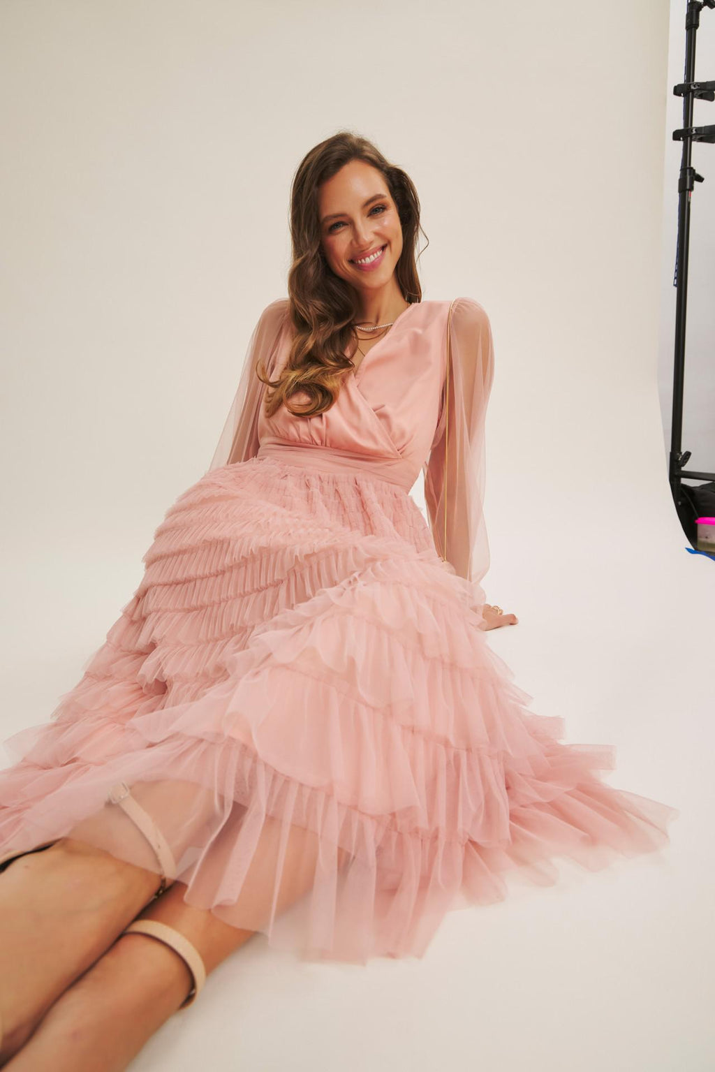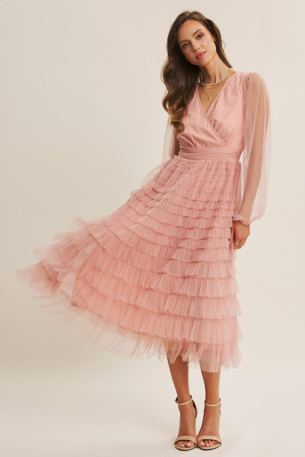 Mesh ruffled midi dress. Features a surplice neckline, smocked back, sheer long balloon sleeves, and layered ruffle skirt. Ideal for fall weddings, parties, or evening occasions. Features - Smocked back - Surplice - Sheer mesh - Midi dress - Long balloon sleeves - Ruffled skirt Size + Fit Model is 5'9.5" and wearing a size Small Please refer to our size chart.