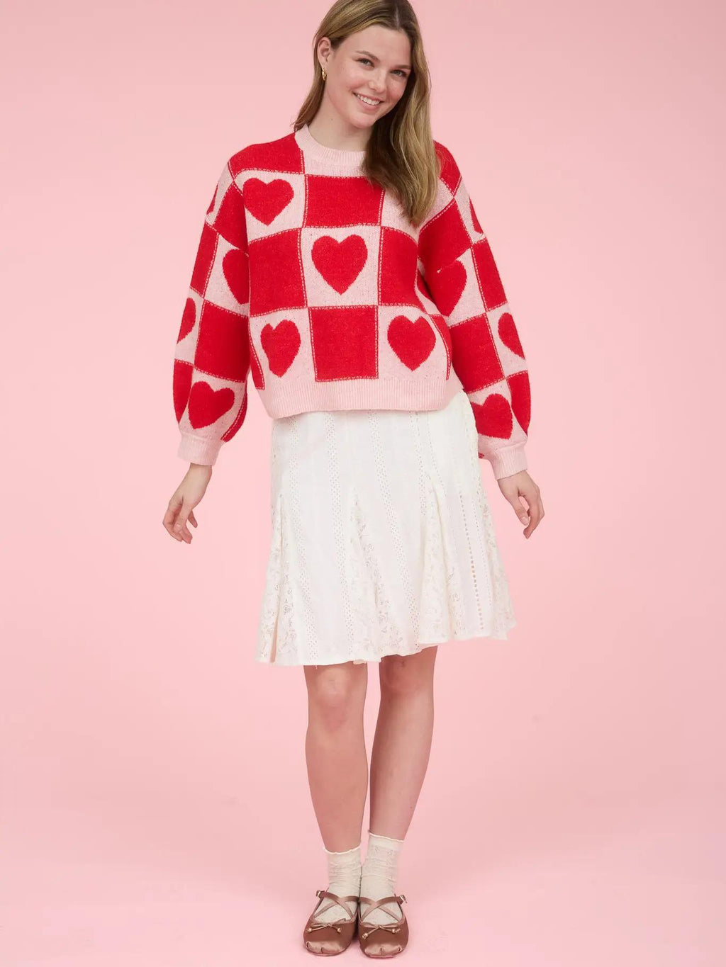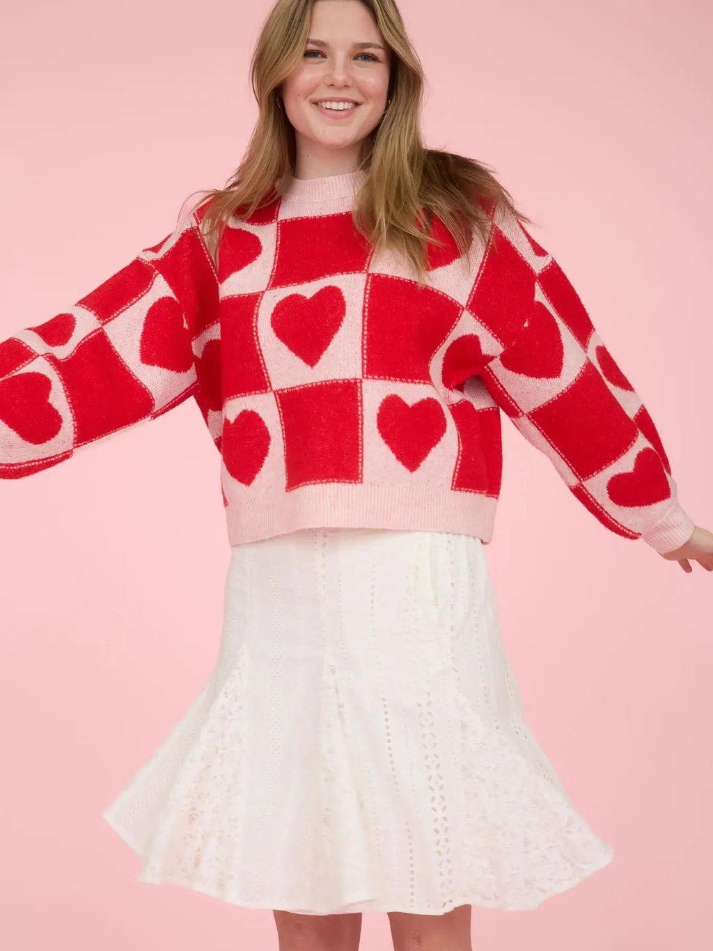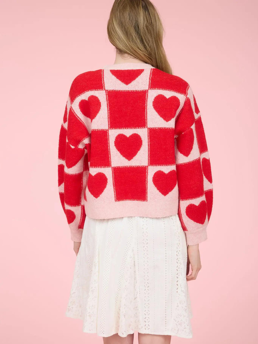Red Heart Checkered Pattern Crew Neck Knit Sweater
