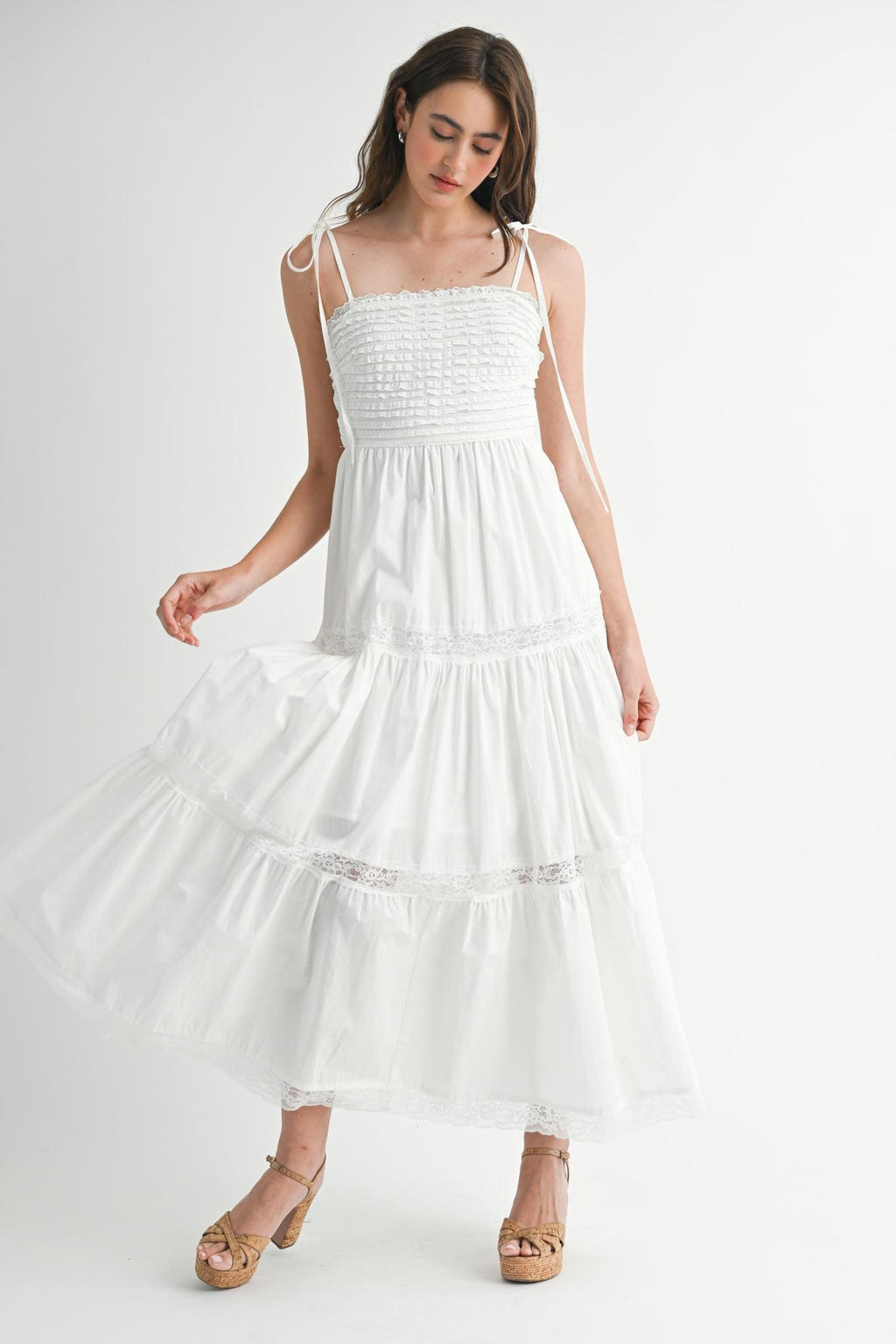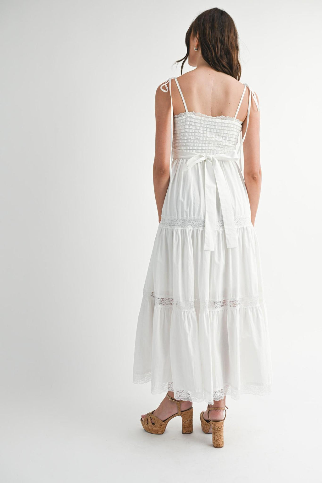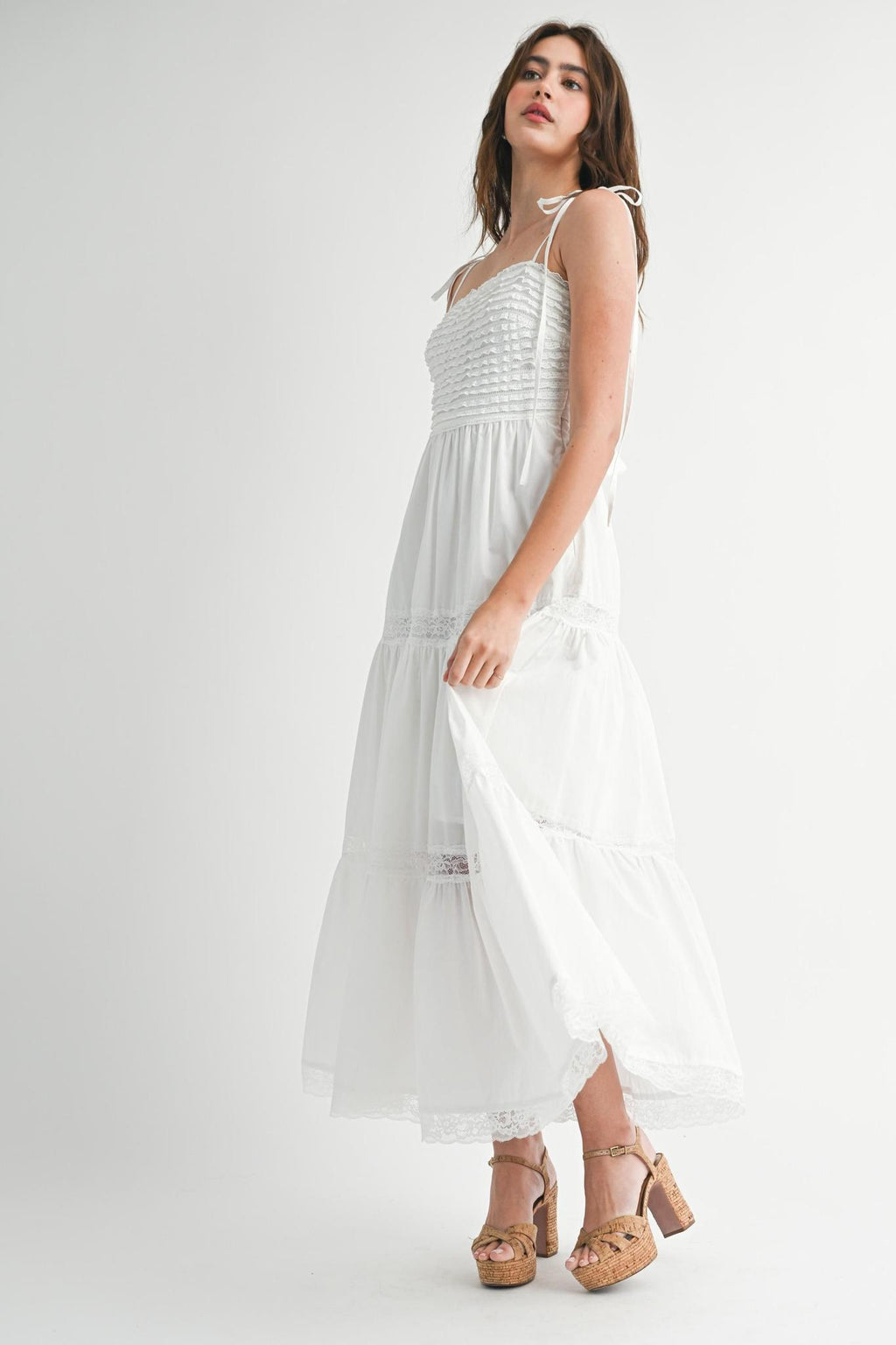 Ruffle textured bodice self tie spaghetti strap lace trim skirt midi dress. Side invisible zipper. Lining.