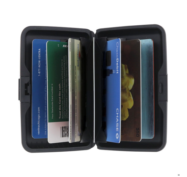 The ScanSafe Security Wallet features seven accordion-style slots in water-resistant hard shell casing with snap closure. Durable aluminum alloy is infused with certified RFID technology to guard against identity theft.