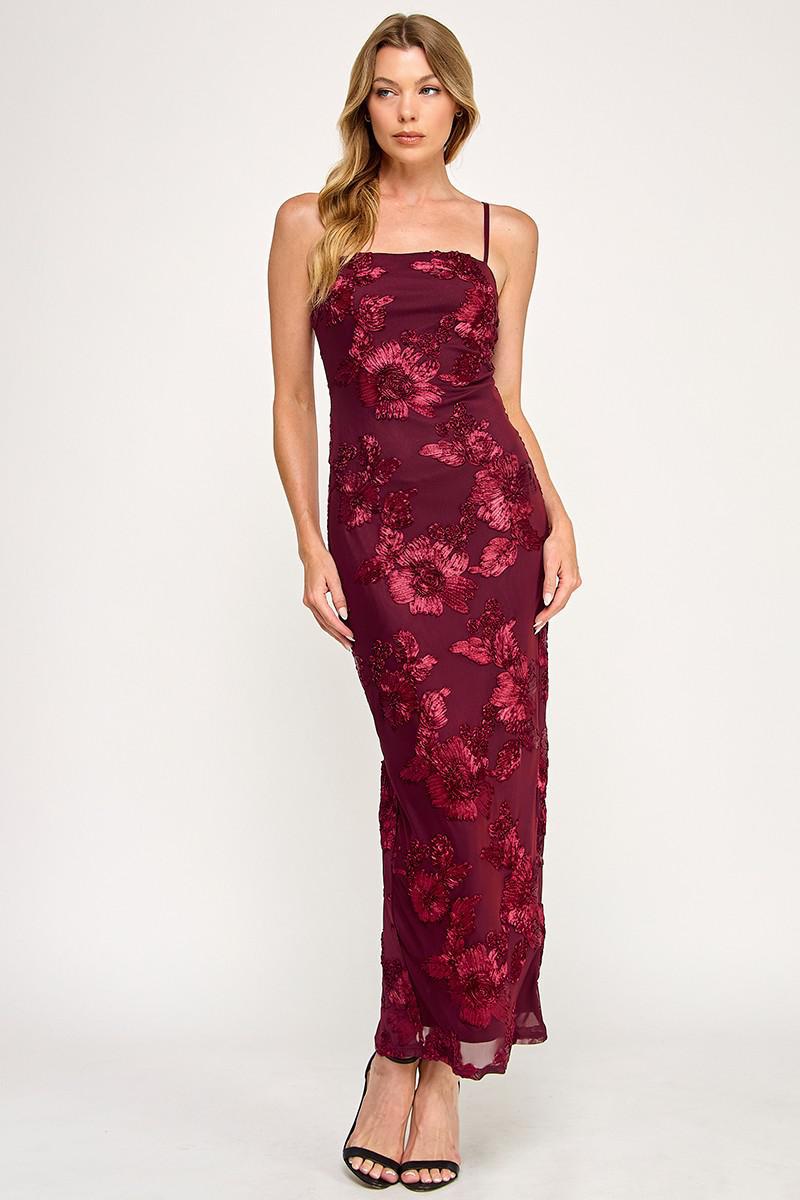 -Mesh floral embroidered maxi dress -Straight, square neckline -Adjustable spaghetti straps -Hidden back zipper -Floor-length evening dress -Floral embroidery and sequin embellishments -Straight skirt with a subtle flare at the hem -Formal occasions, galas, or evening events -Holiday dress -New years