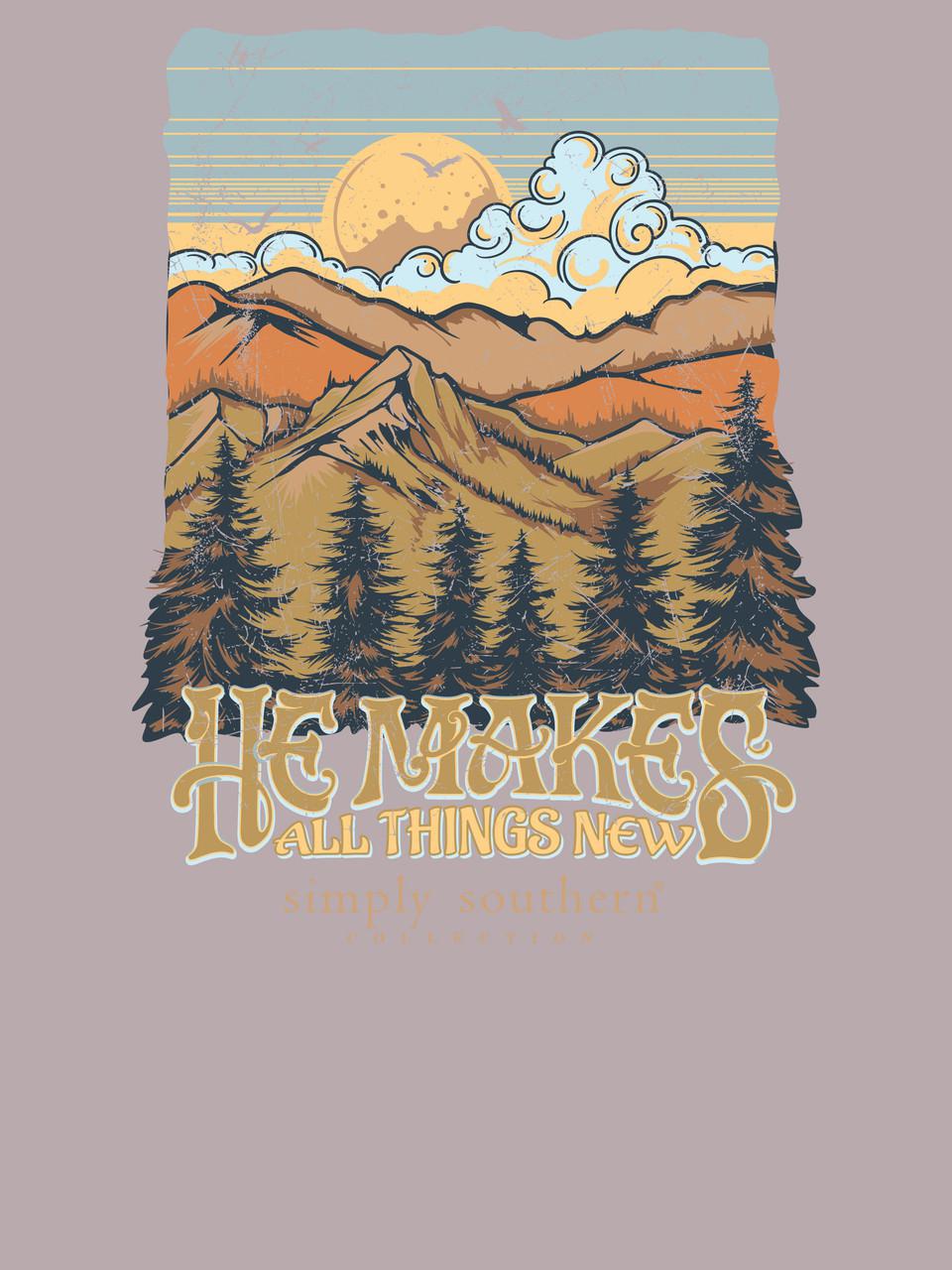 Driftwood grey long sleeve shirt with the phrase 'He makes all things new' beneath a mountain wilderness scene at sunrise. Simply Southern logo below, on left chest, and along right sleeve. 100% cotton. Unisex sizing.
