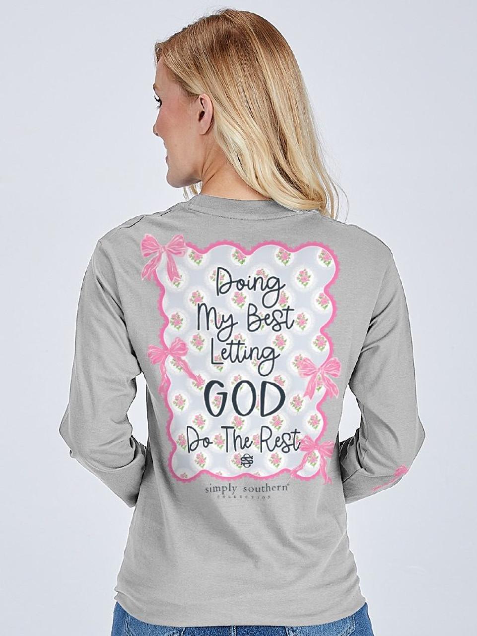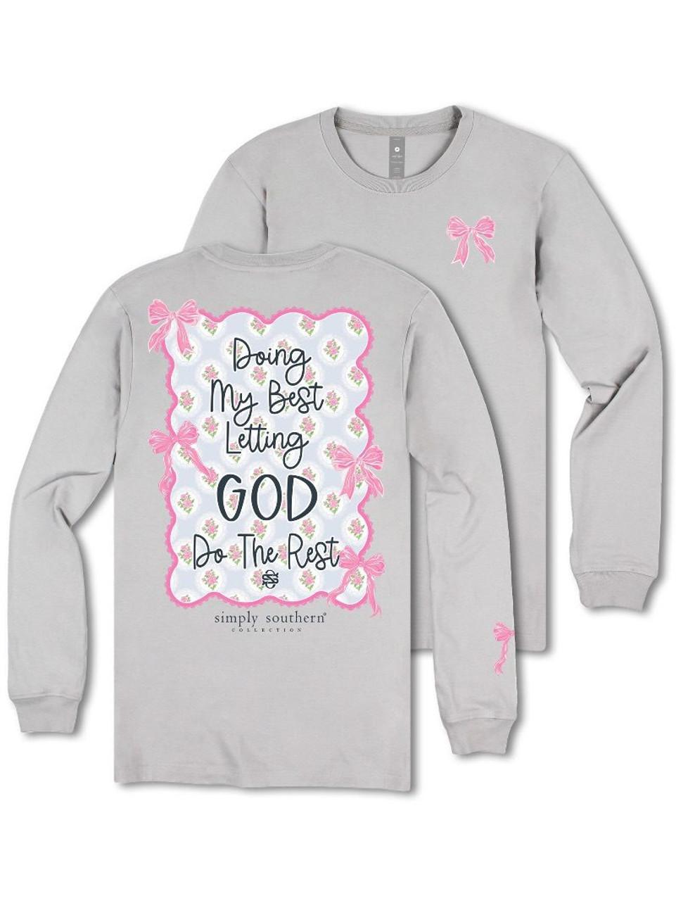 Sport grey long sleeve shirt with the phrase 'Doing my best, Letting God do the rest' adorned with pink bows on a floral background. Simply Southern logo below. Pink bow on left chest and right sleeve. 100% cotton. Unisex sizing.