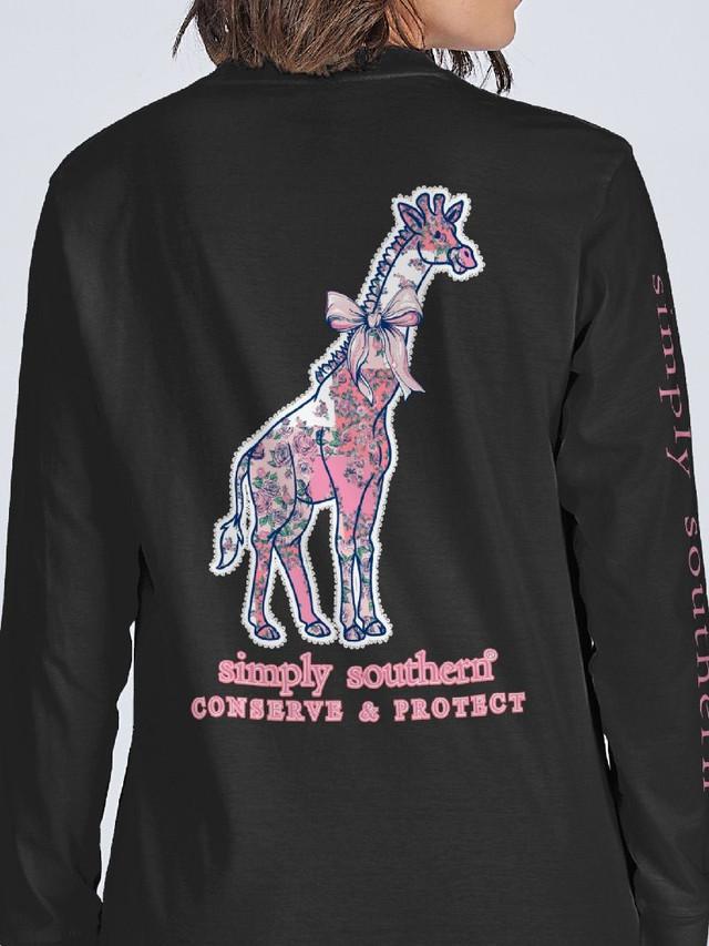 Black long sleeve shirt with the silhouette of a giraffe filled with a pink quilted floral pattern. Simply Southern logo below, on left chest, and along right sleeve. 100% cotton. Unisex youth sizing. Giraffe tracker.