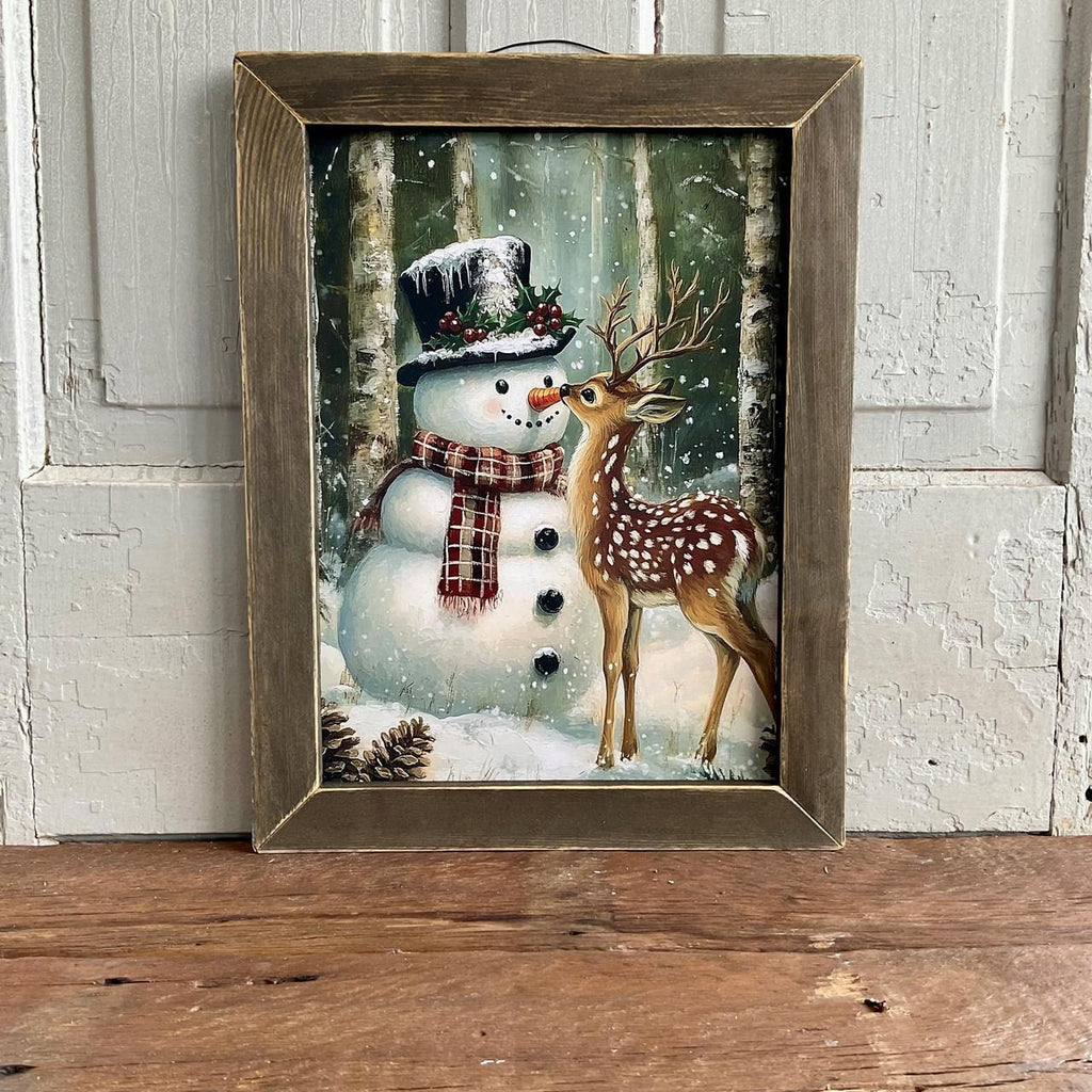 Add a touch of whimsy to your home decor with our charming 'Stealing a Snack' framed print. This delightful winter scene captures a playful moment between a fawn and a snowman, perfect for adding a festive flair to any room.