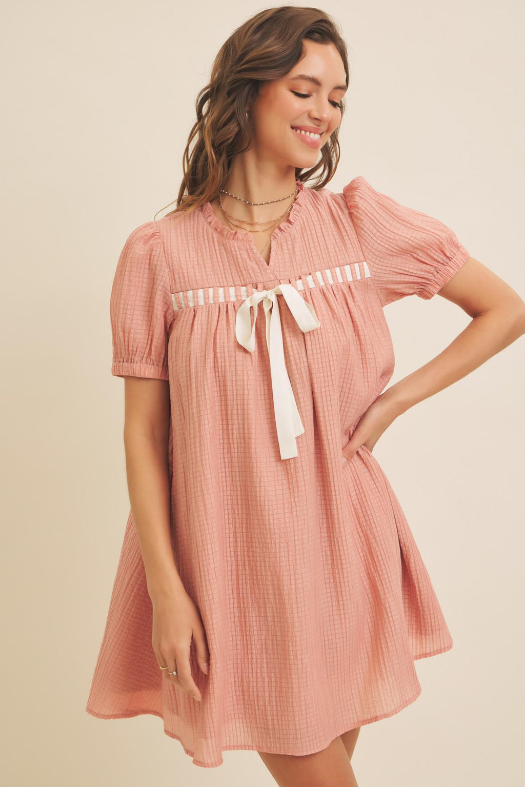 Features - Textured fabric - Babydoll silhouette - Mini dress - Front bow contrast detail - V-neckline - Mini ruffles on the neck - With pockets - Lined - Short puff-sleeves Contents - SELF: 85% LC 15% NYLON - CONTRAST, LINING: 100% POLYESTER Size + Fit Model is 5'9.5" and wearing a size Small. Please refer to our size chart.