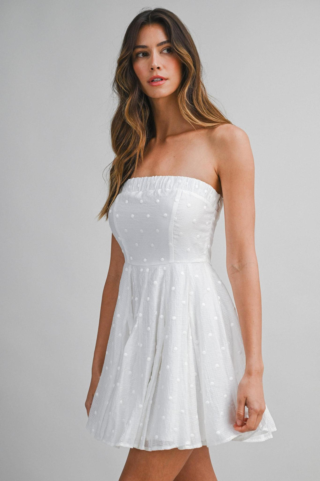 Strapless mini dress with a subtle textured dot pattern. Features a fitted bodice with a softly gathered waist seam that flows into a flared skirt. Designed with an elasticated smocked back