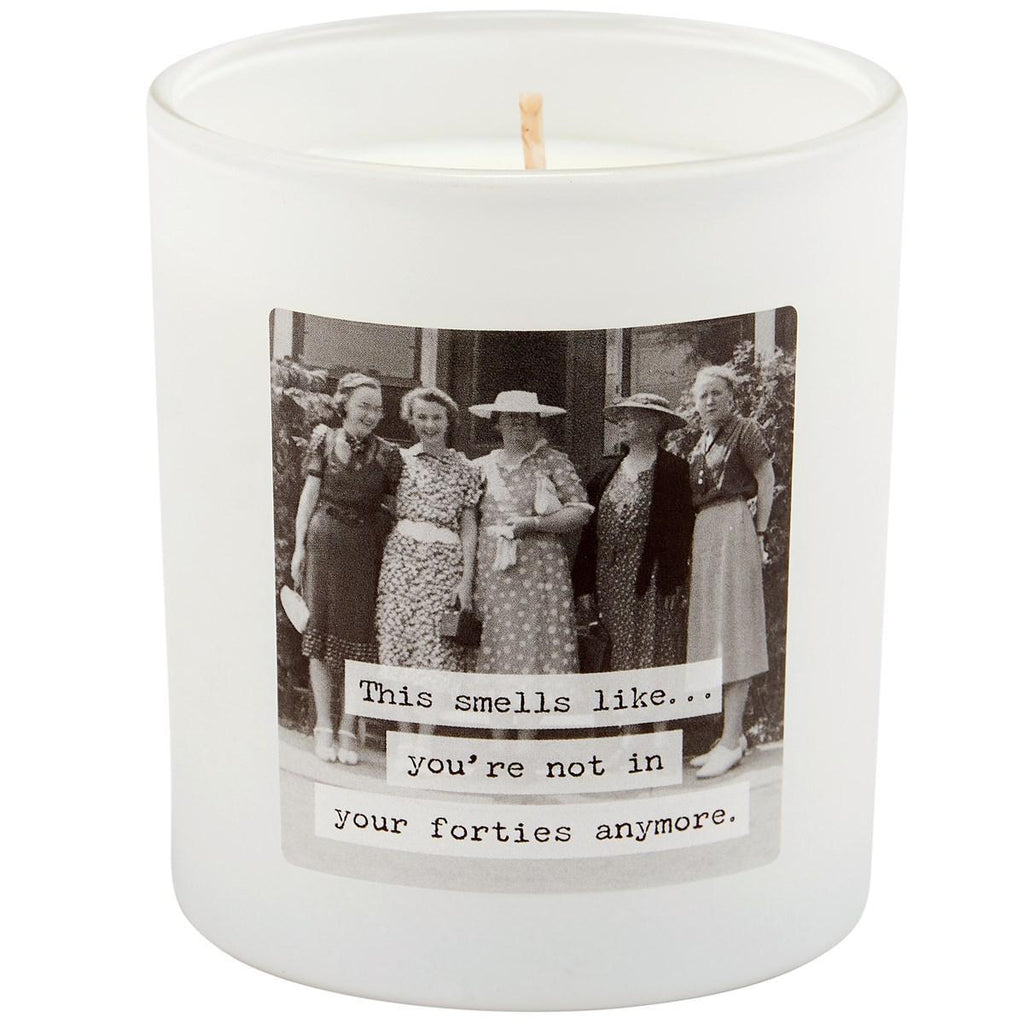 A candle from our Trash Talk By Annie Collection displaying a double-sided design of a vintage black and white photograph on frosted white glass complemented with a humorous sentiment that reads "This Smells Like... You're Not In Your Forties Anymore." Candle features soy-based wax and a cotton wick with 35 hours of burn time activating a calming Cedar scent. Our Not In Your Forties candle includes a dust cover and plastic lid for protection and polished appearance. A hilarious home accent that is great for everyday gifting.
