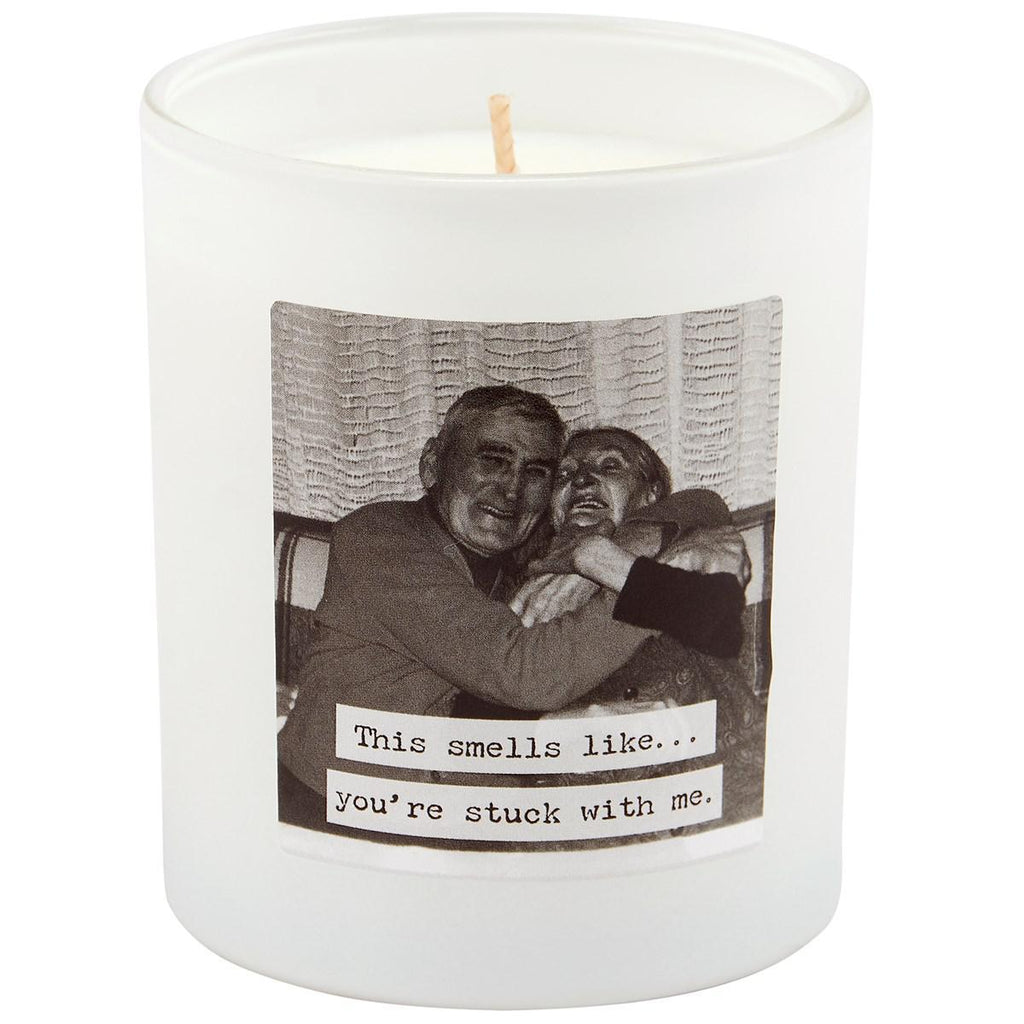 A candle from our Trash Talk By Annie Collection displaying a double-sided design of a vintage black and white photograph on frosted white glass complemented with a humorous sentiment that reads "This Smells Like... You're Stuck With Me." Candle features soy-based wax and a cotton wick with 35 hours of burn time activating a lovely Rose scent. Our Stuck With Me candle includes a dust cover and plastic lid for protection and polished appearance. A hilarious home accent that is great for everyday gifting.