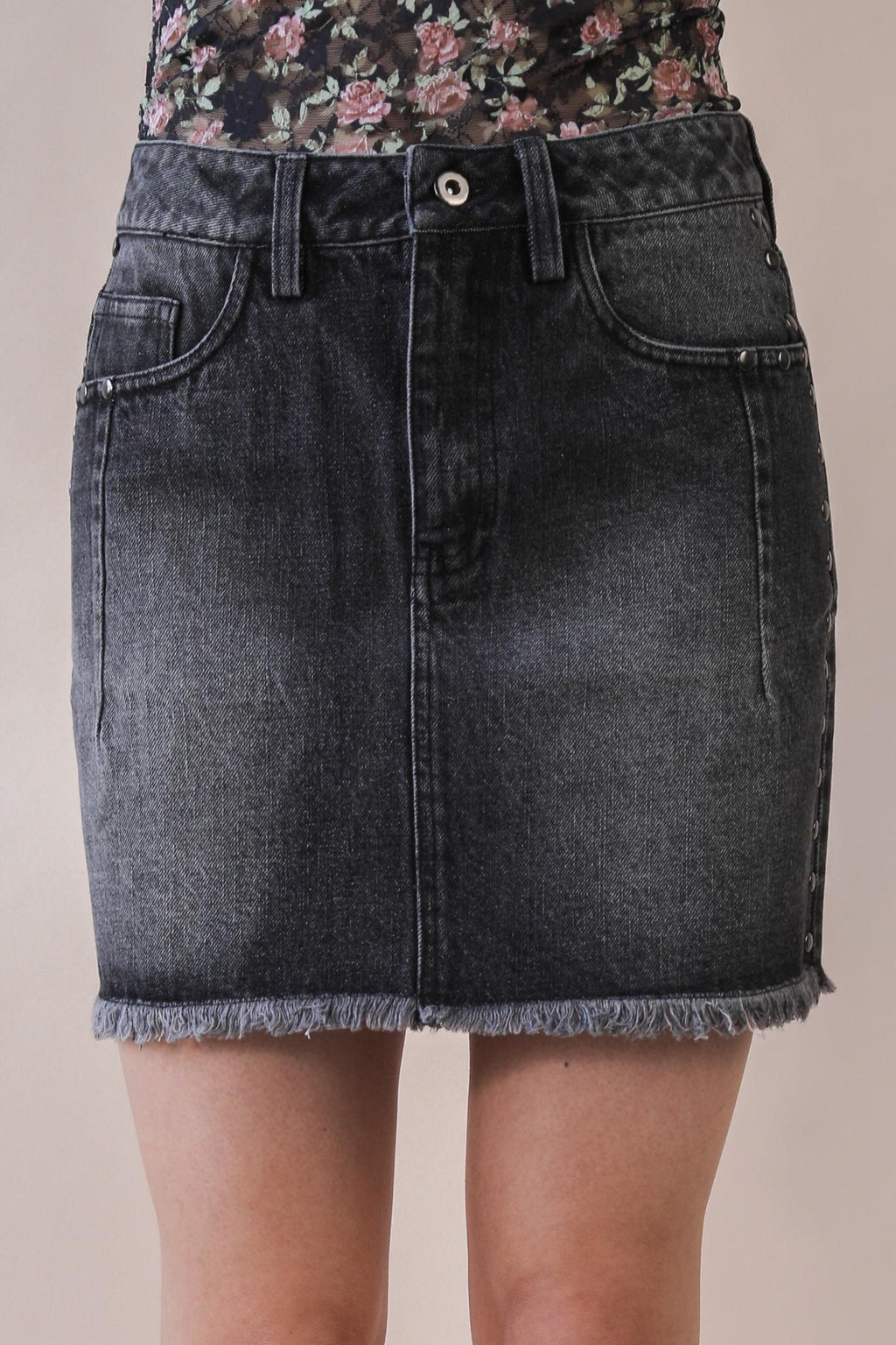 - VERY JEAN Side Stud Detail Washed Denim Mini Skirt - Low Rise - Front Button & Zipper - Side & Back Pockets - Frayed Hem - Thanksgiving Outfit - Christmas Outfit (Model height: 5"10", wearing a Small, 1-2-2-2-1 Size Ratio, NEW IN)