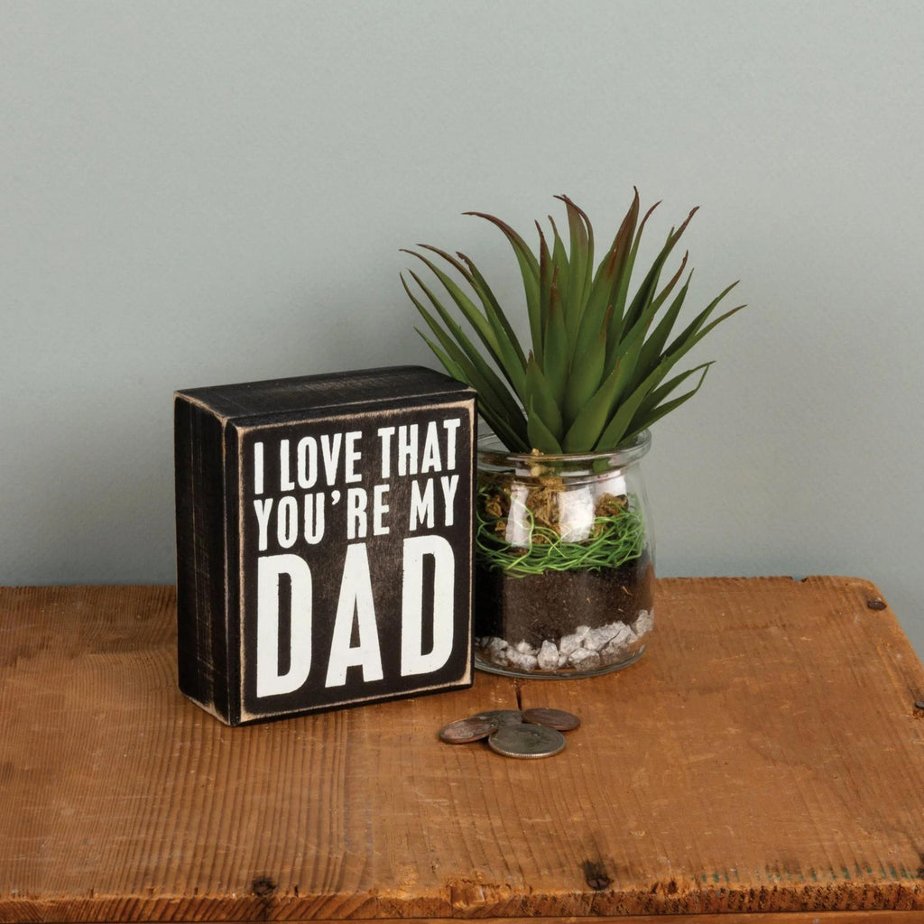 A classic black and white wooden box sign featuring a distressed "I Love That You're My Dad" sentiment. Easy to hang or can free-stand alone.